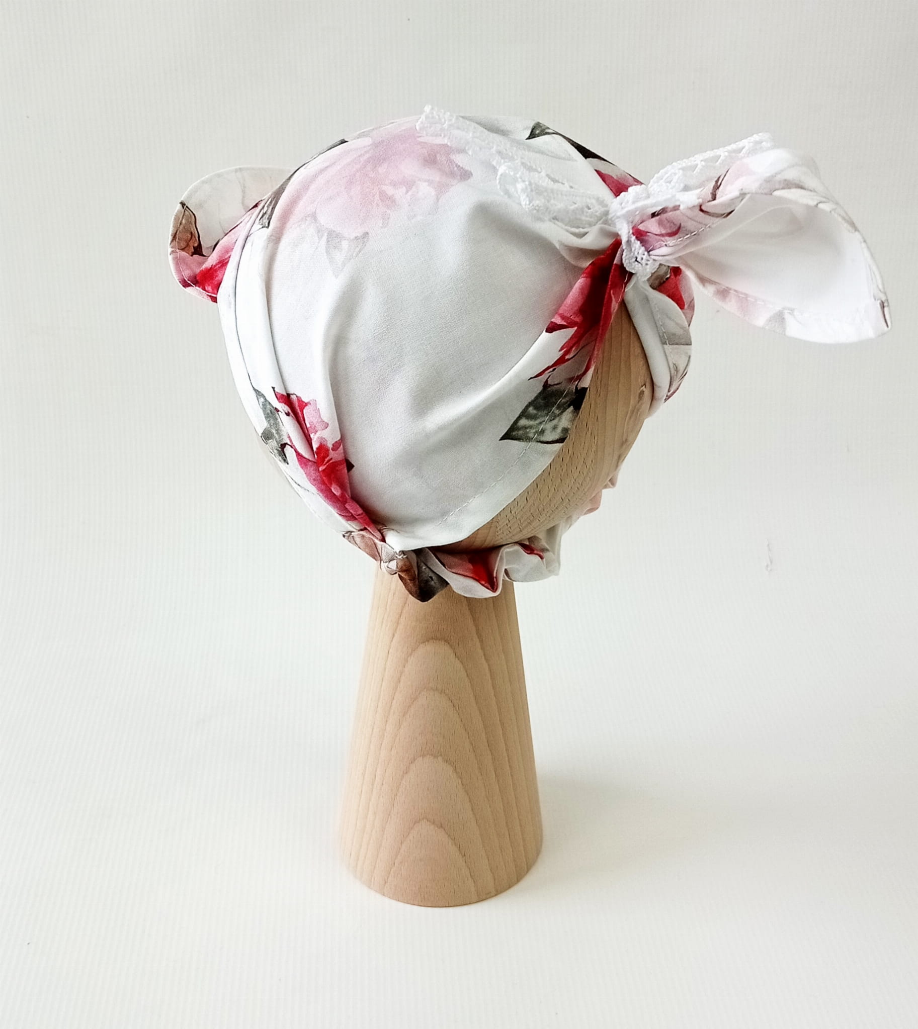 Chustka z daszkiem czerwone kwiaty ; wiązanie z koronki