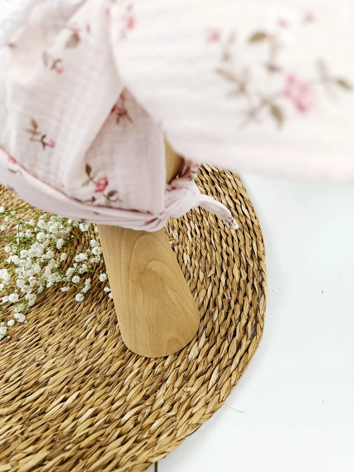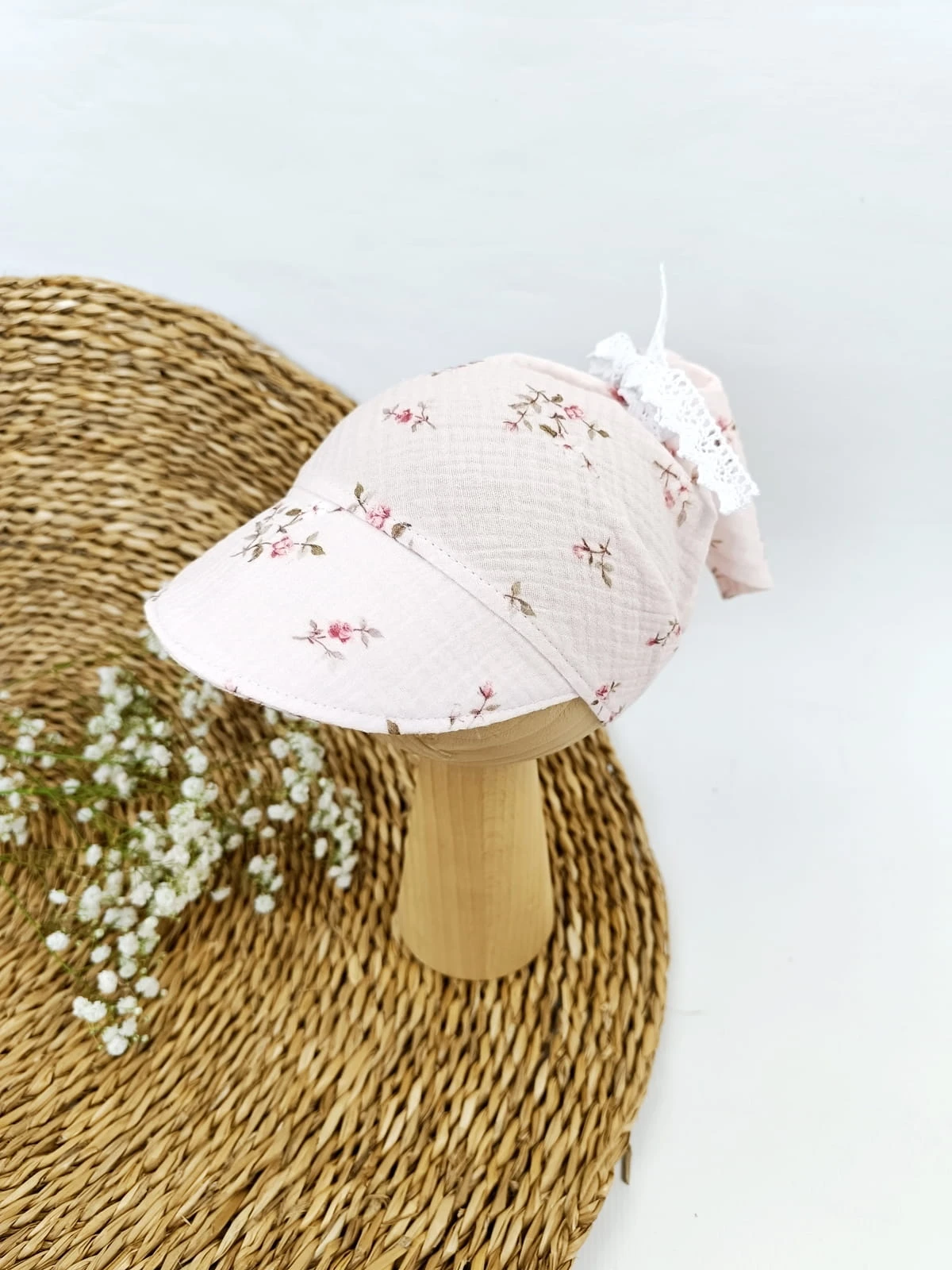 Chustka z daszkiem muślin DROBNE RÓŻYCZKI RÓŻ; wiązanie: koronka (1)