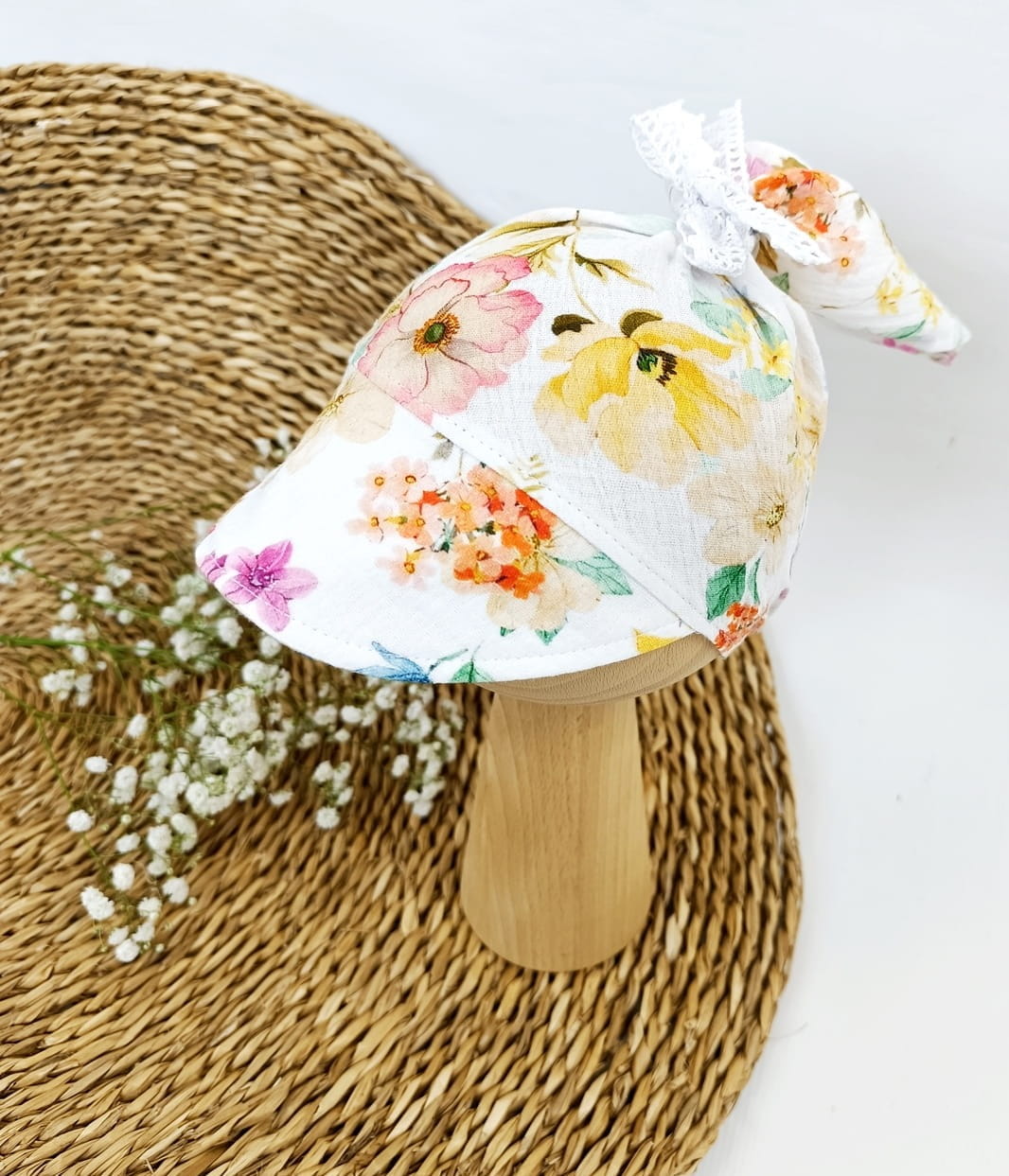 Chustka z daszkiem muślin Letnie kwiaty; wiązanie: koronka
