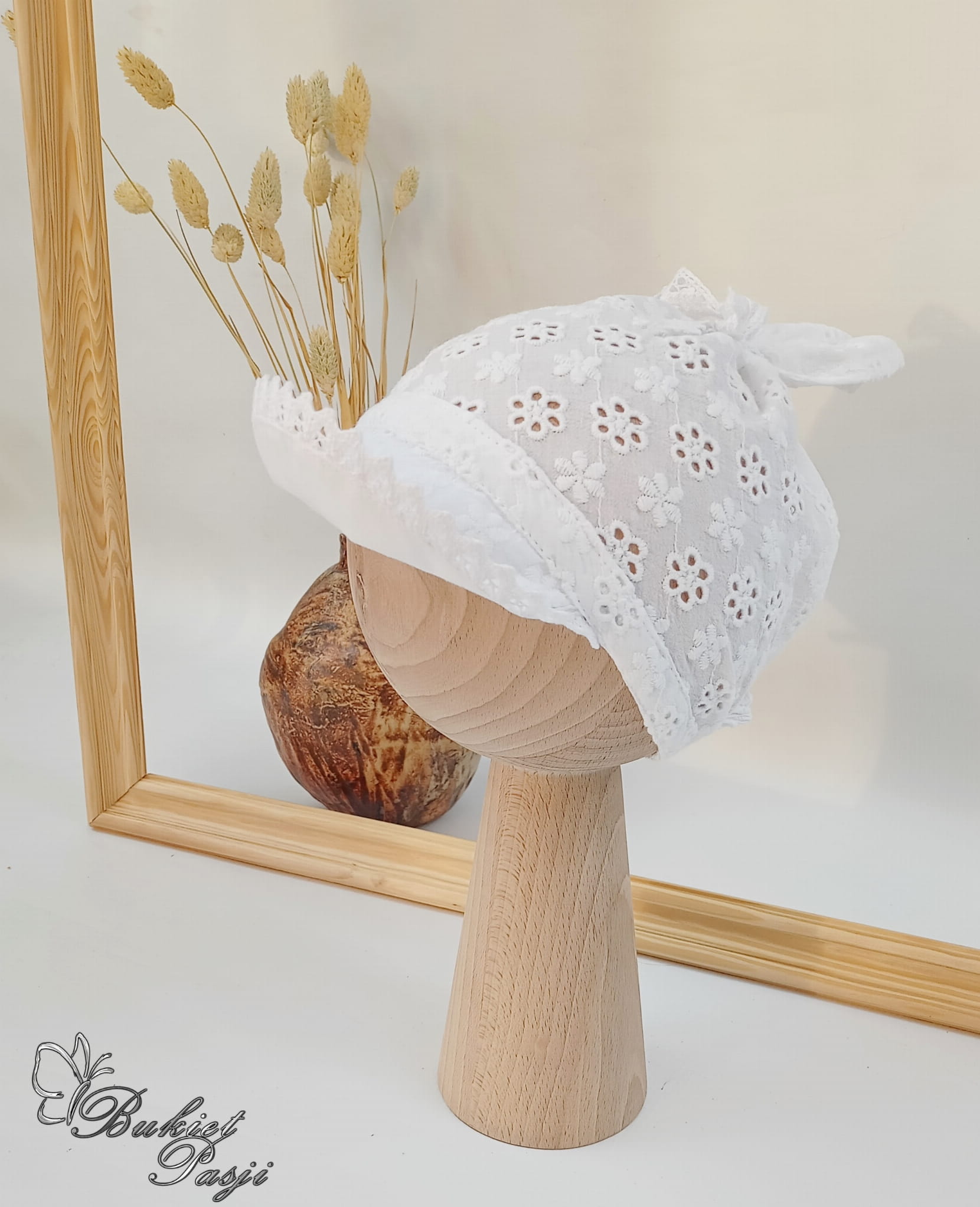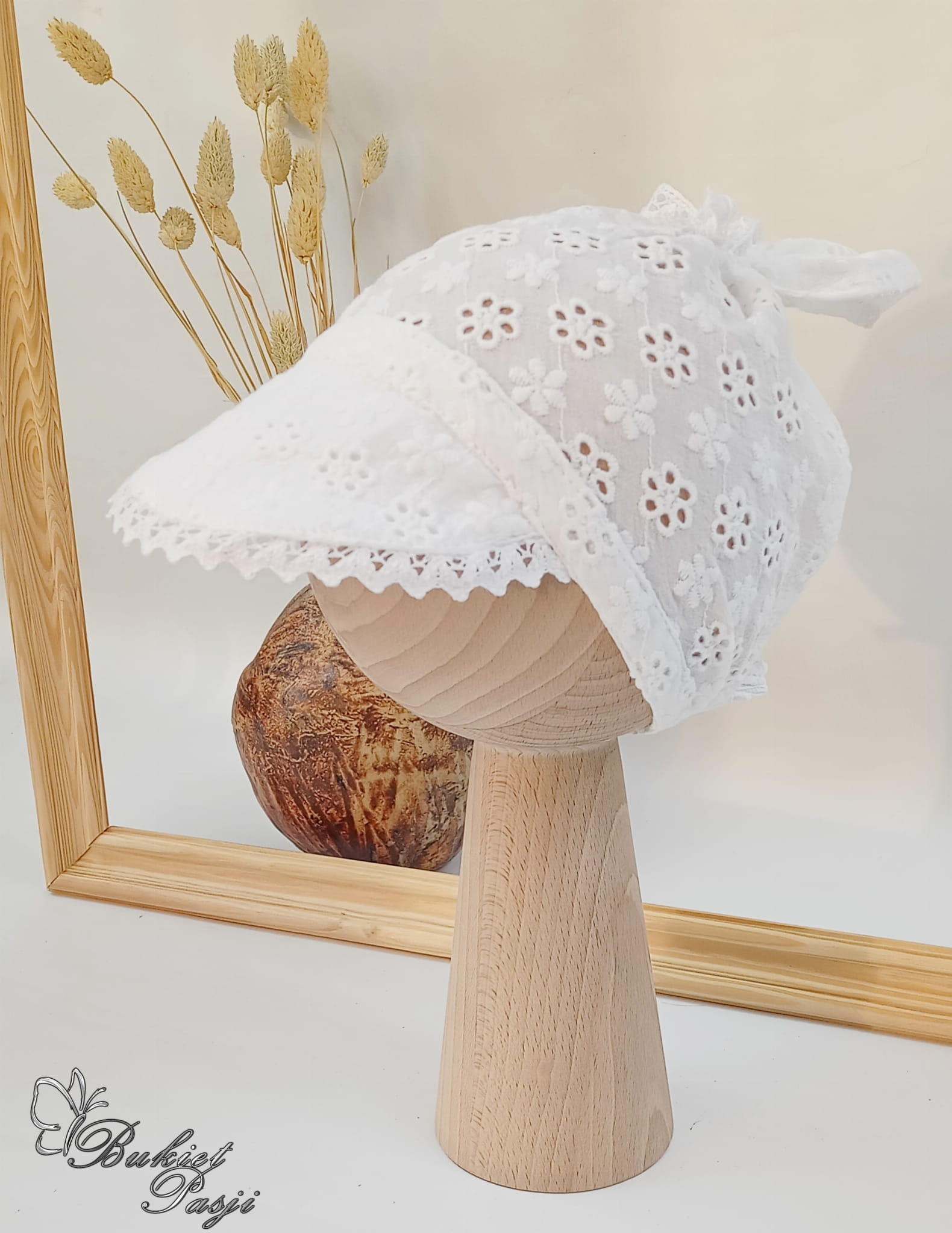 Chustka z daszkiem z koronką haft biały kwiatuszek, wiązanie korona
