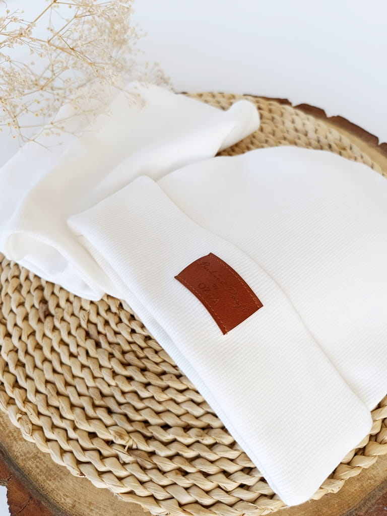 Materiał ściągacz bawełniany prążkowany: To wyjątkowo elastyczny i komfortowy materiał, który idealnie dopasowuje się do kształtu głowy i szyi dziecka. Bawełna zapewnia oddychalność, a prążkowana faktura dodaje estetyki i ciepła.