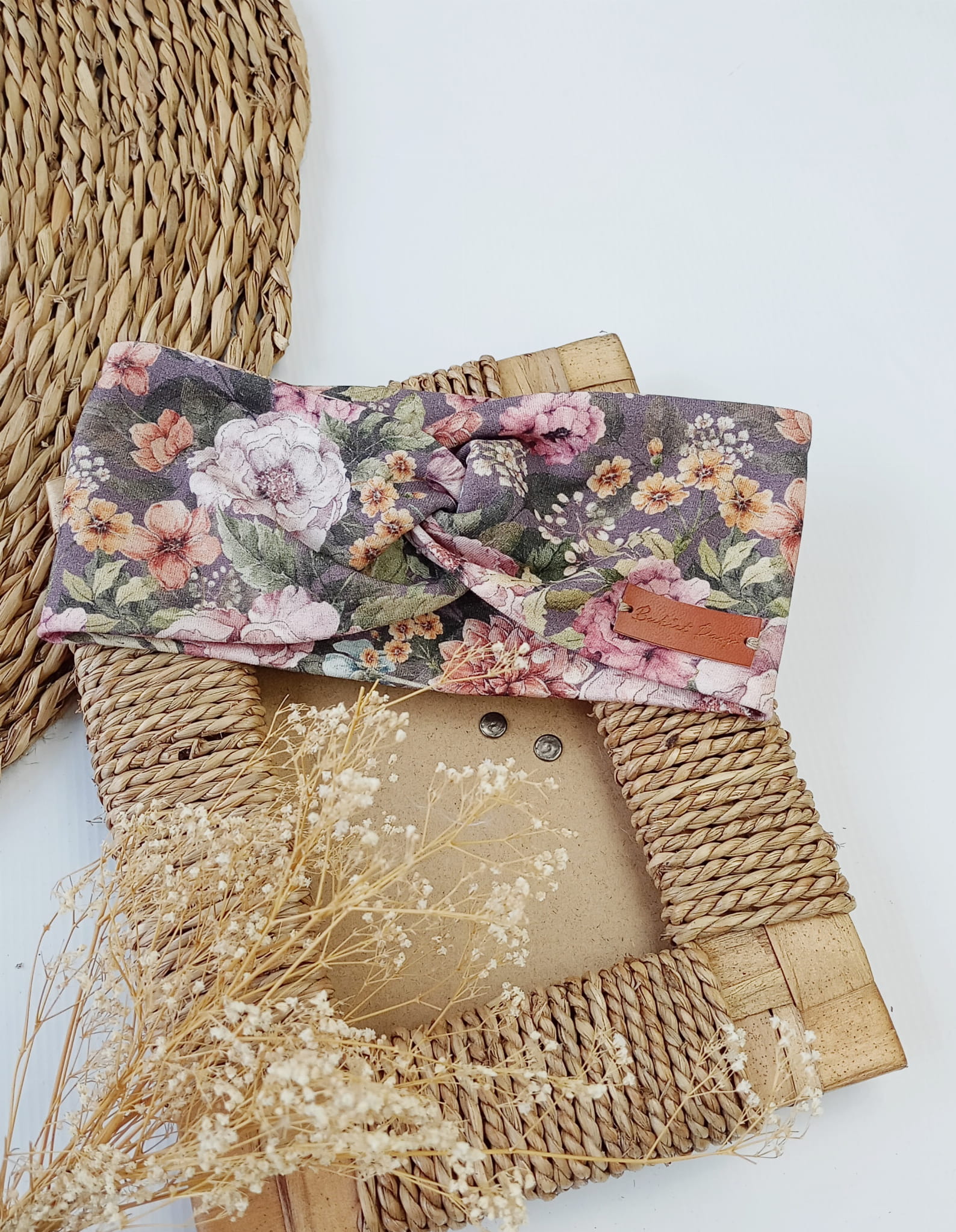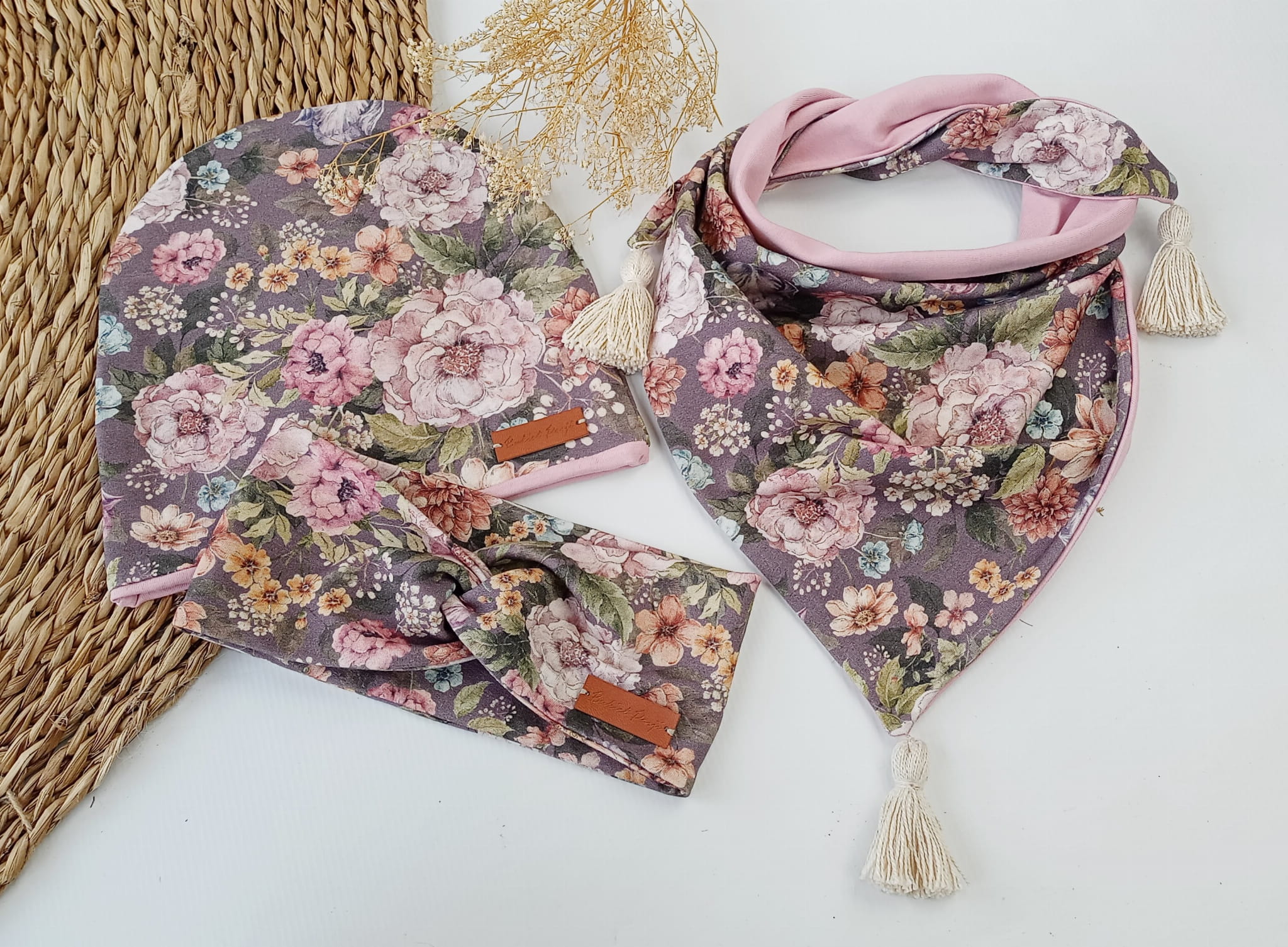 Zestaw czapka podwójna z wzoru i podszyta dzianiną bawełnianą  + opaska przeplatana + chusta wiązana z tyłu.