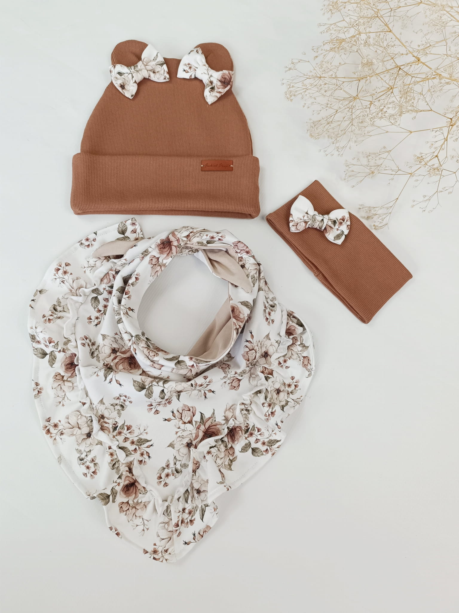 Czapka czekolada z uszkami i kokardkami, z chustą z falbanką NEWBIE ROSIE KREM
