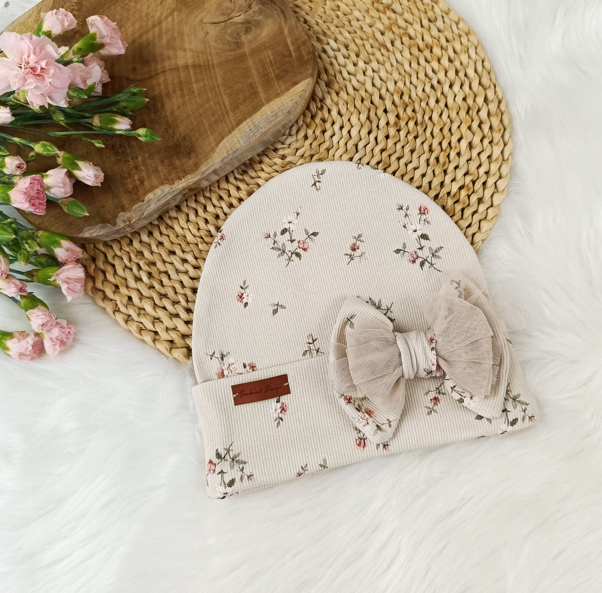 Czapka drobne różyczki beż prążek z kokardą z tiulem