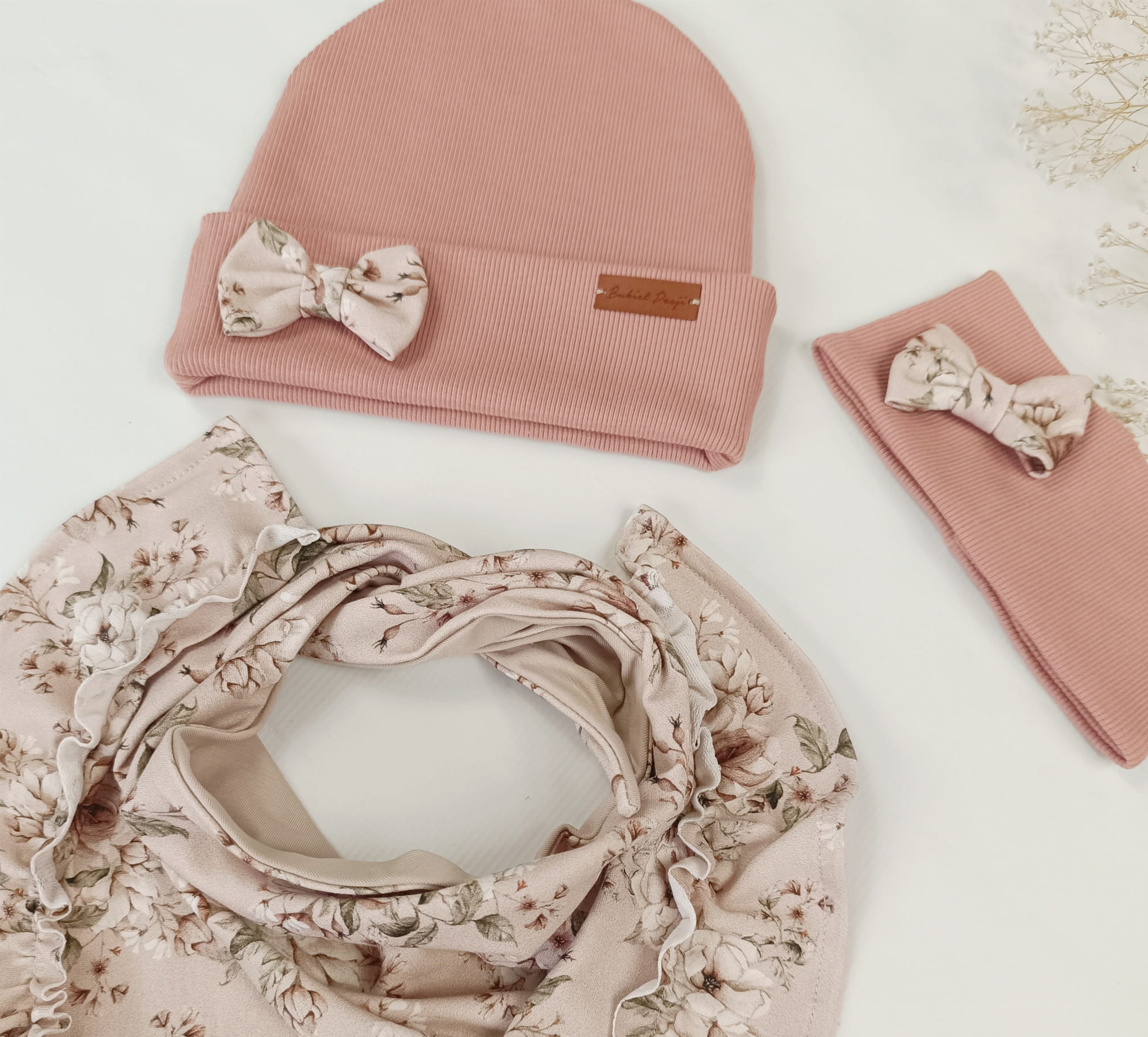Czapka herbal rose z kokardką, z chustą z falbanką NEWBIE ROSIE RÓŻ