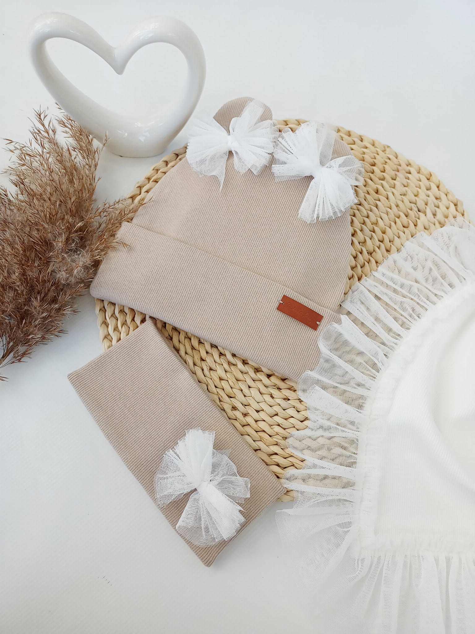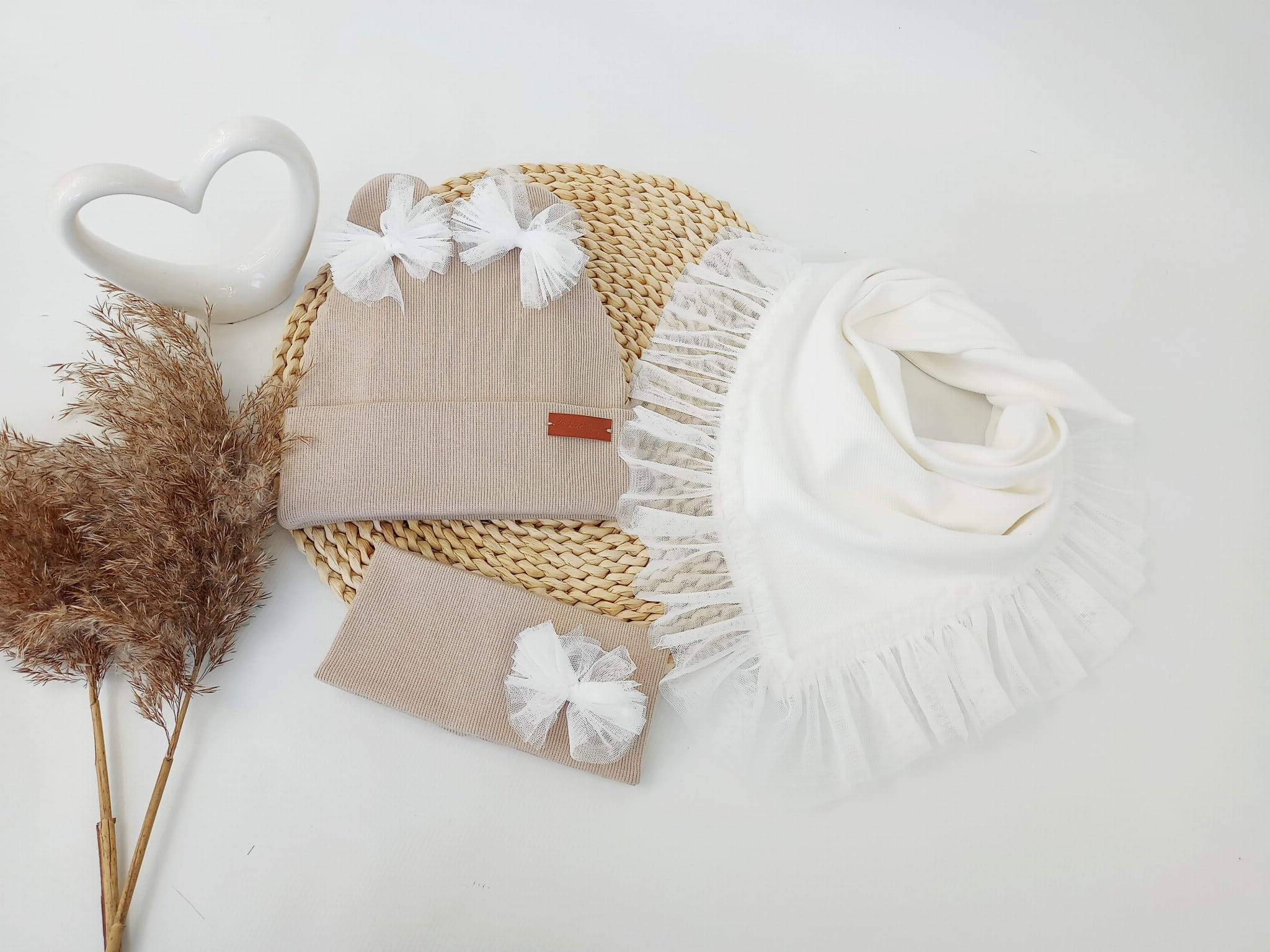 Czapka jasny beż, uszy, z chustą z falbanką z tiulu krem