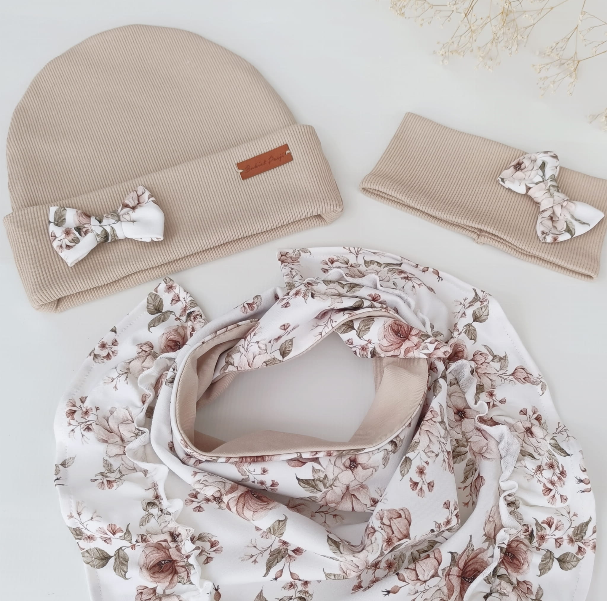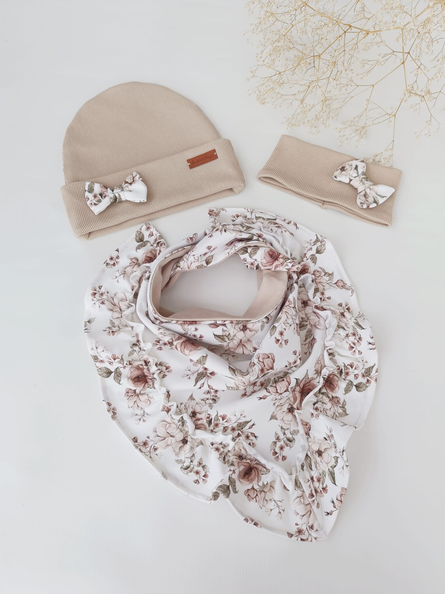 Czapka jasny beż z kokardką, z chustą z falbanką NEWBIE ROSIE KREM