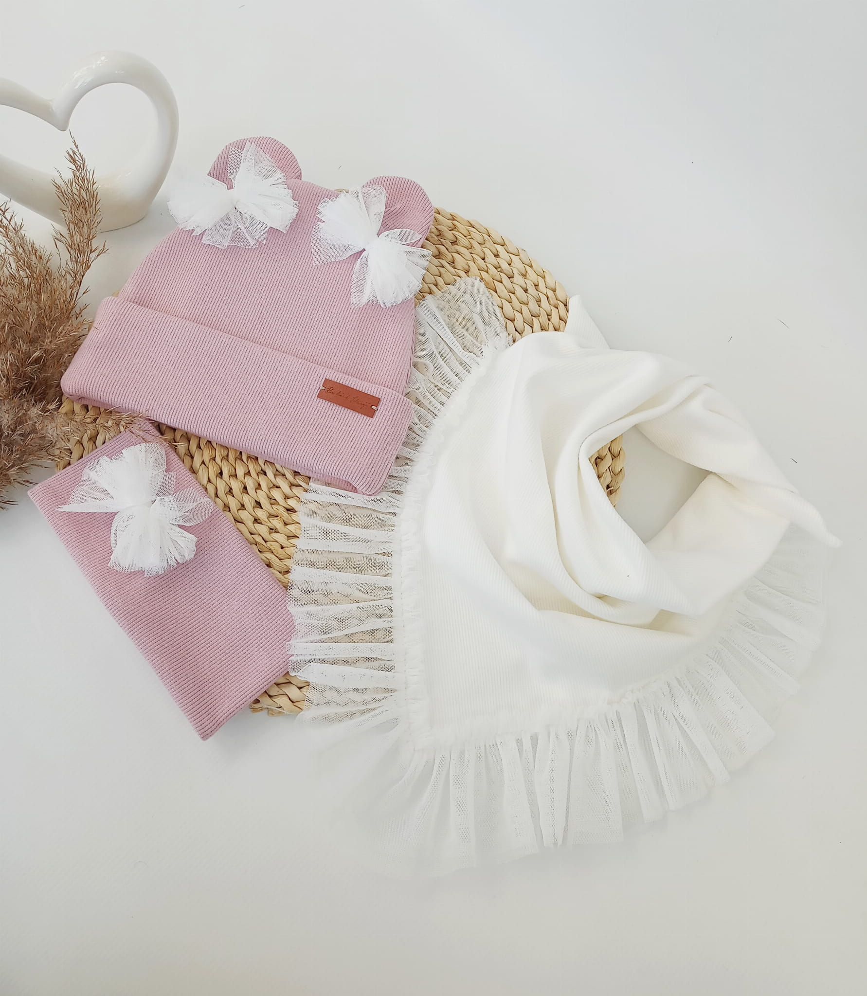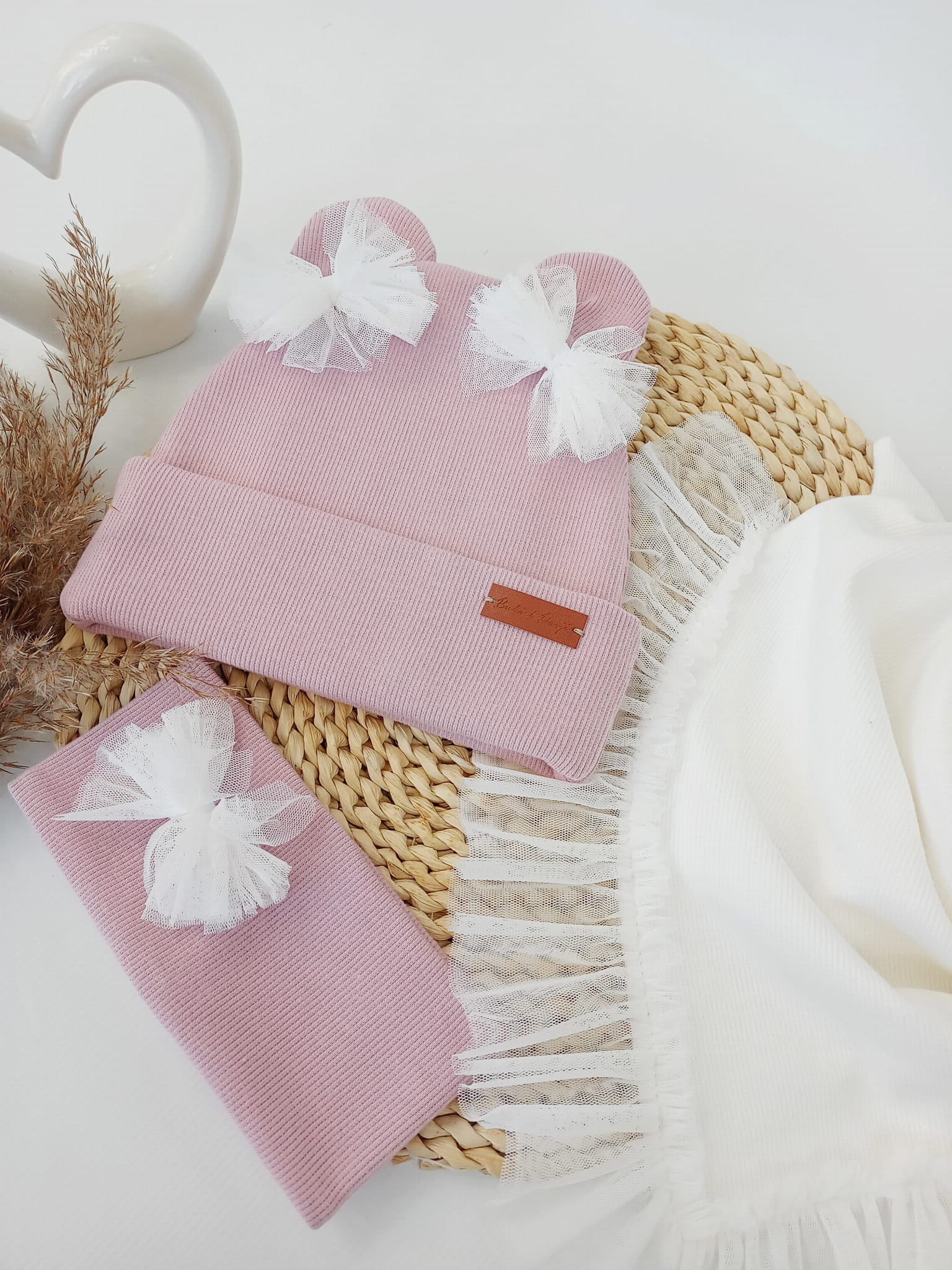 Czapka jasny brudny róż, uszy z chustą z falbanką z tiulu krem