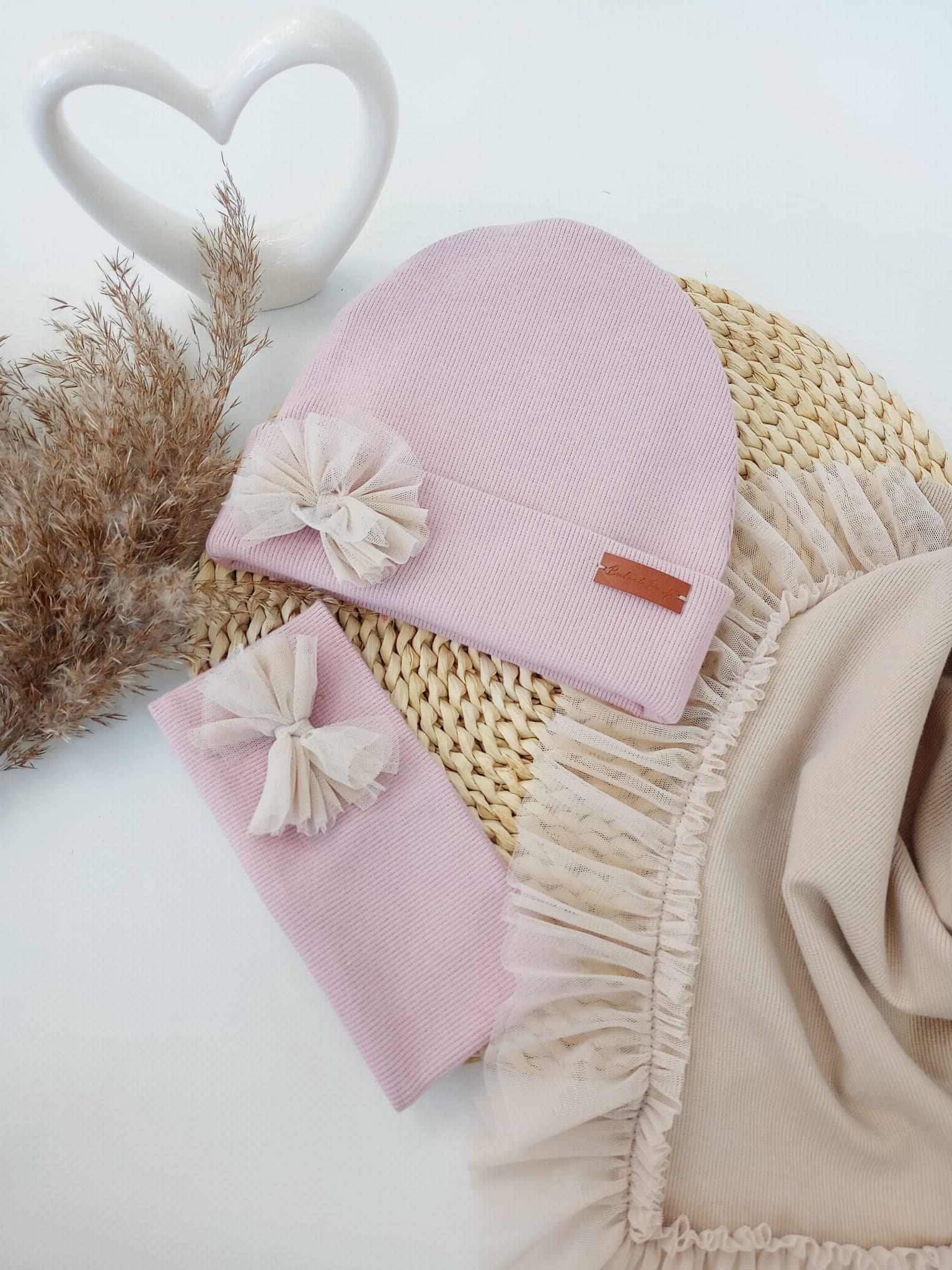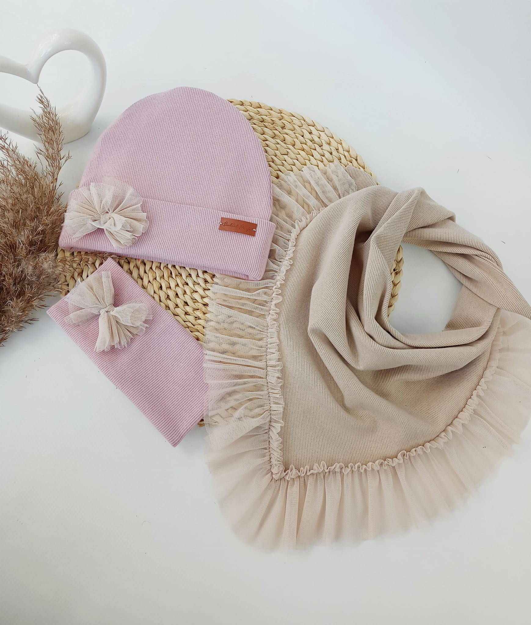 Czapka jasny brudny róż z chustą z falbanką z tiulu jasny beż