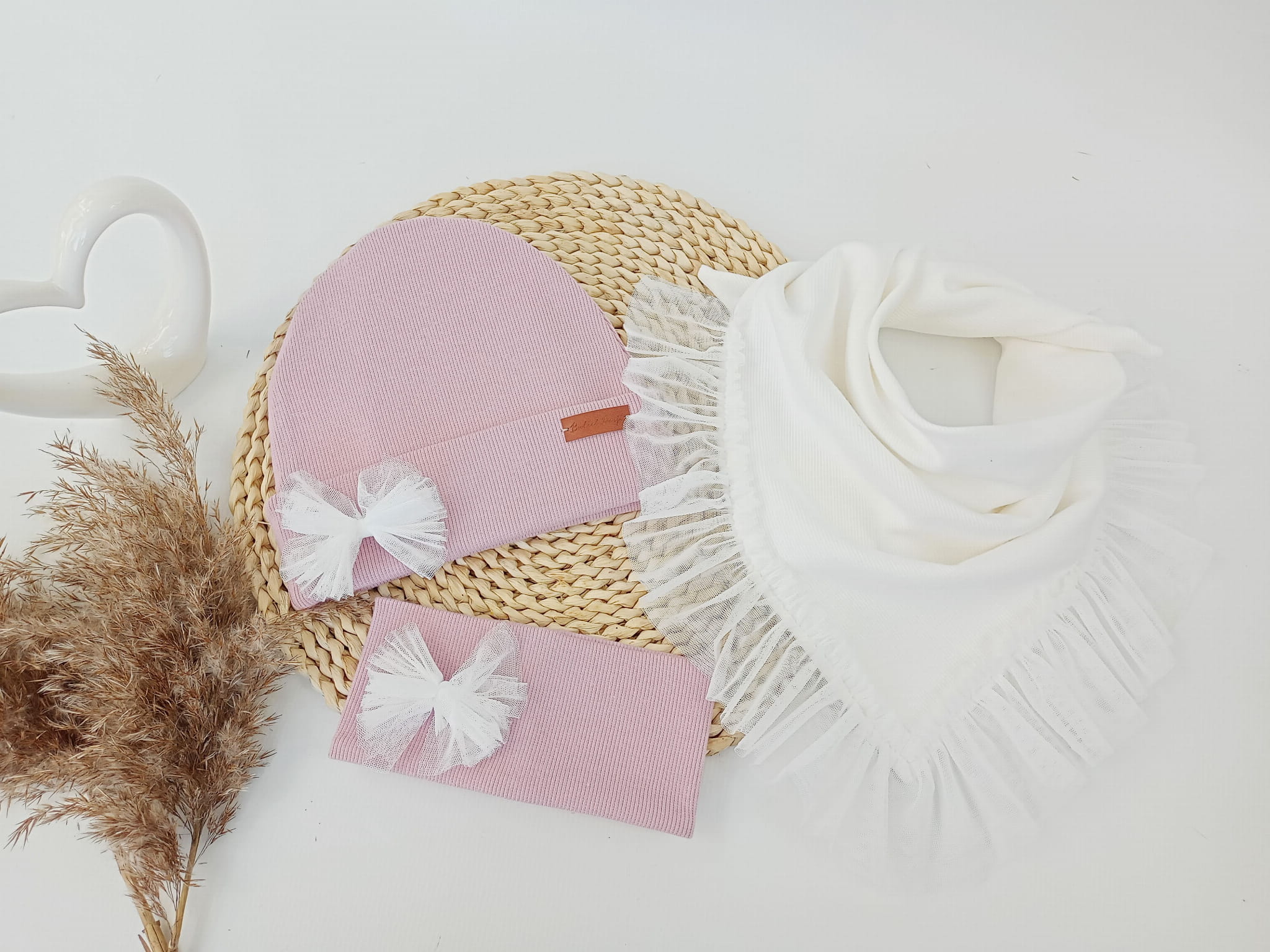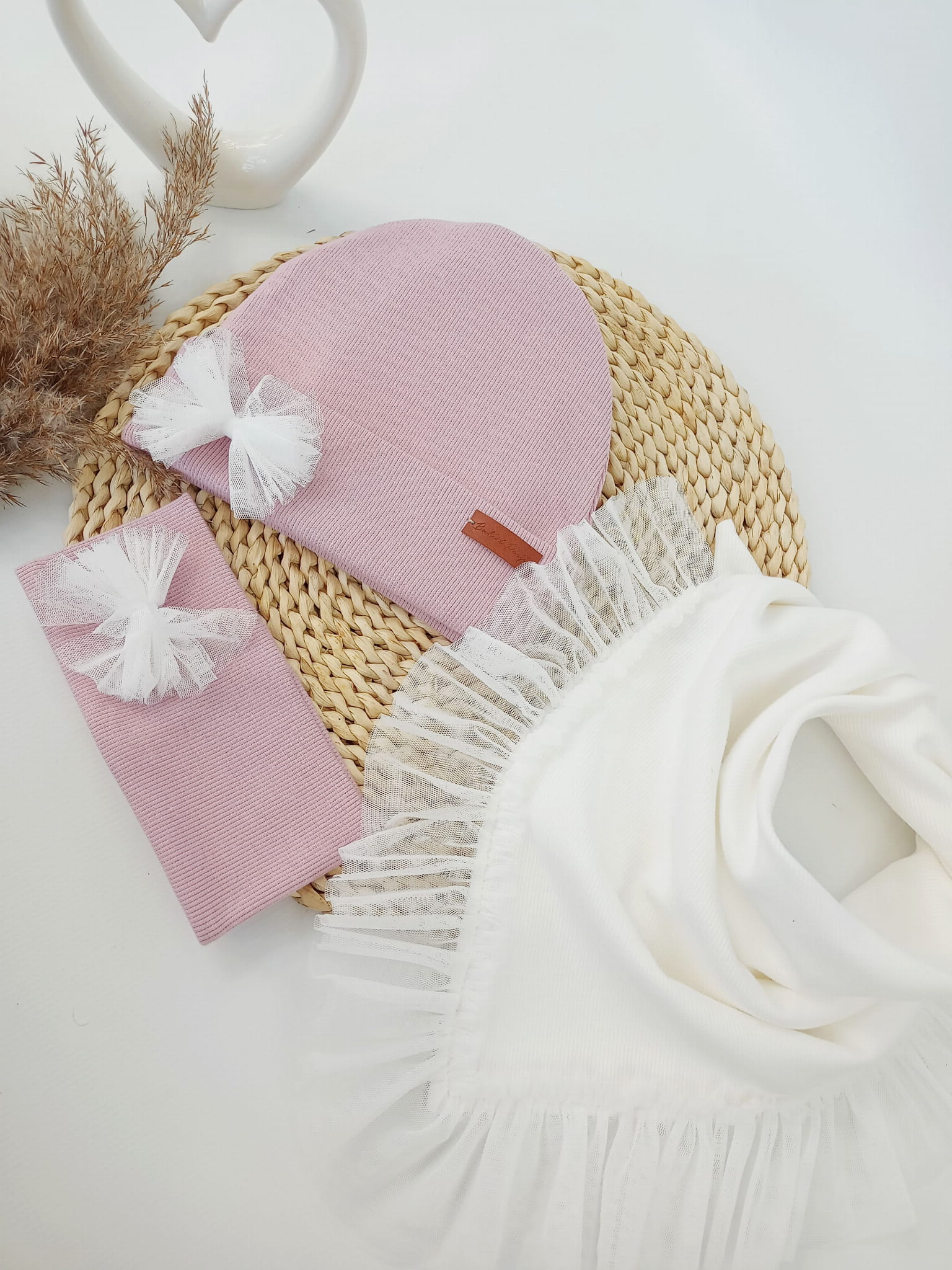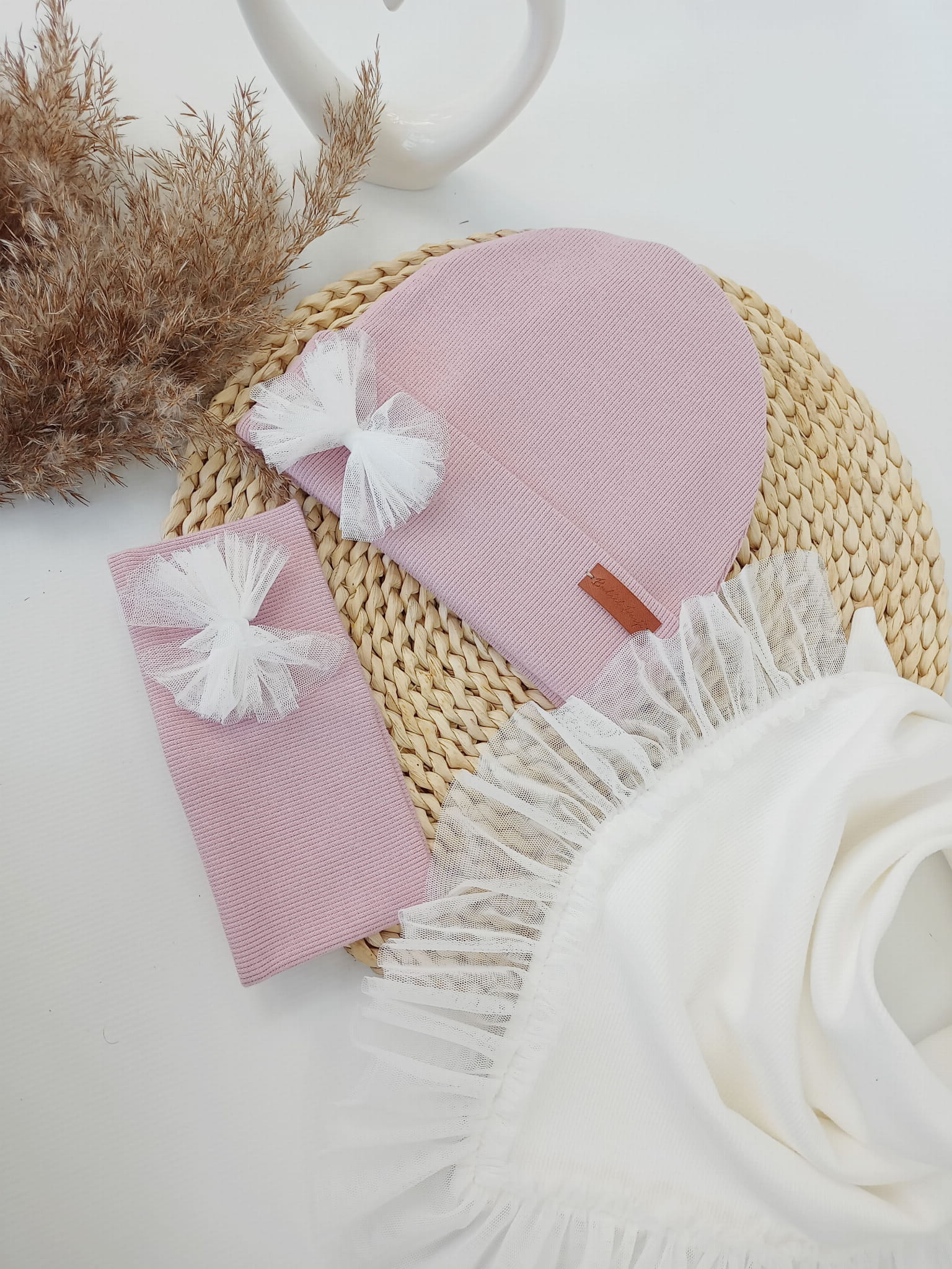 Czapka jasny brudny róż z chustą z falbanką z tiulu krem
