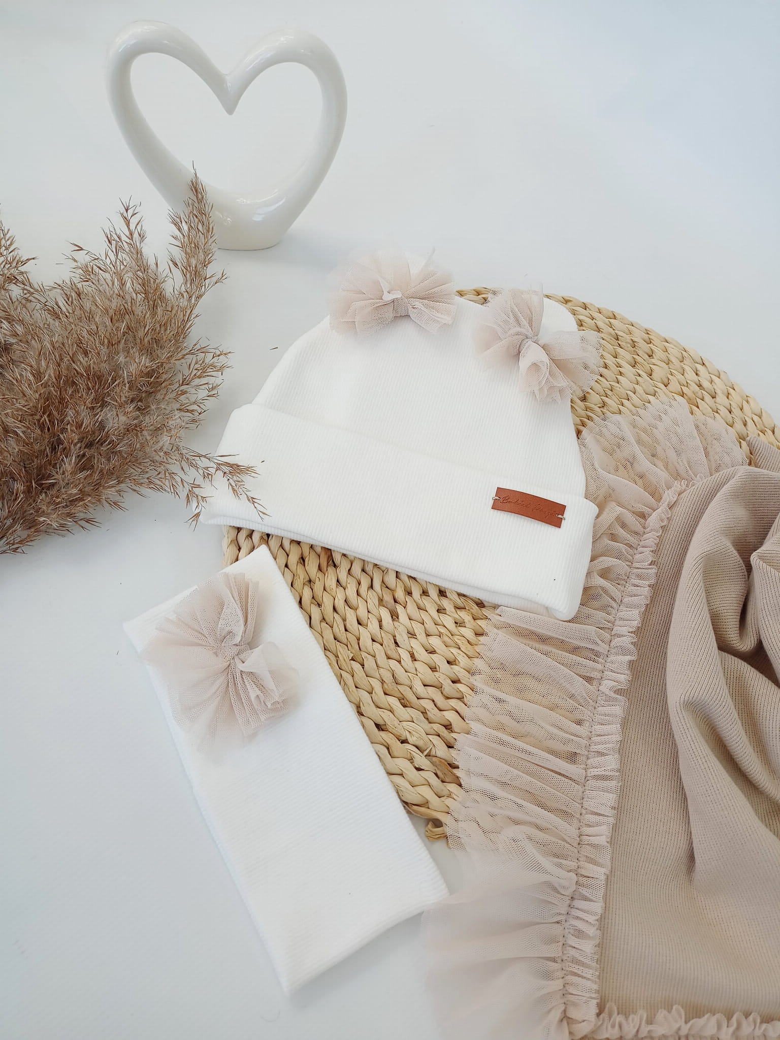 Czapka krem, uszy z chustą z falbanką z tiulu jasny beż