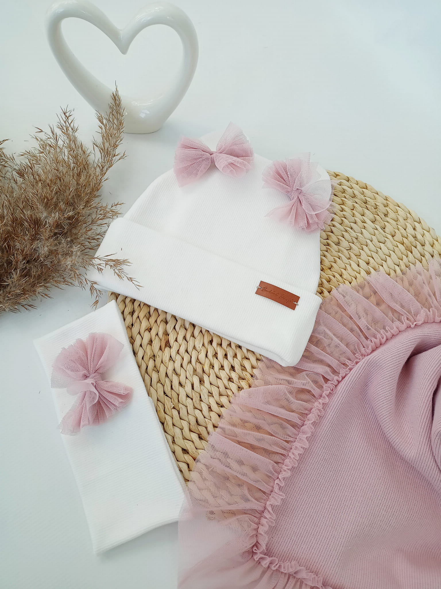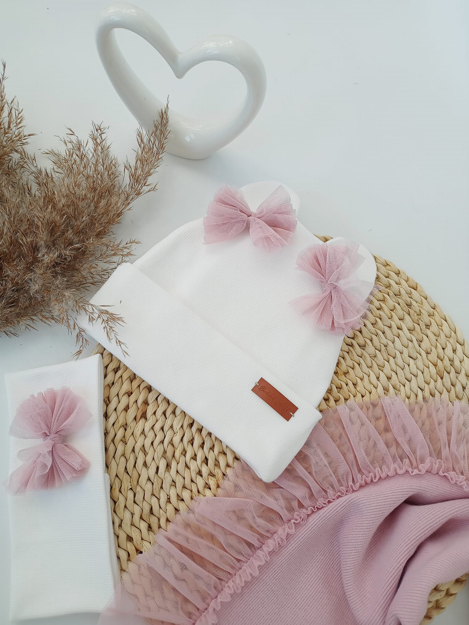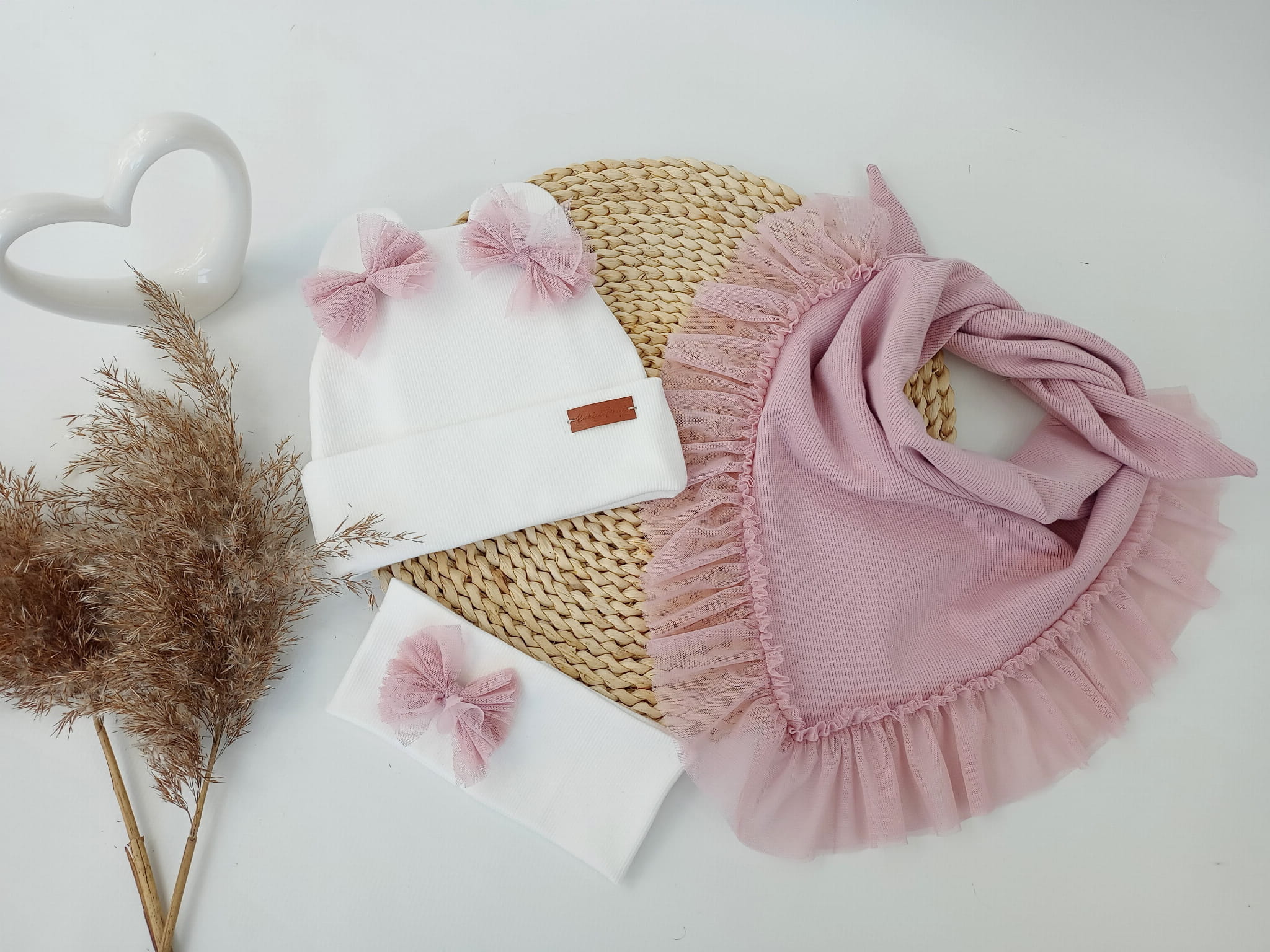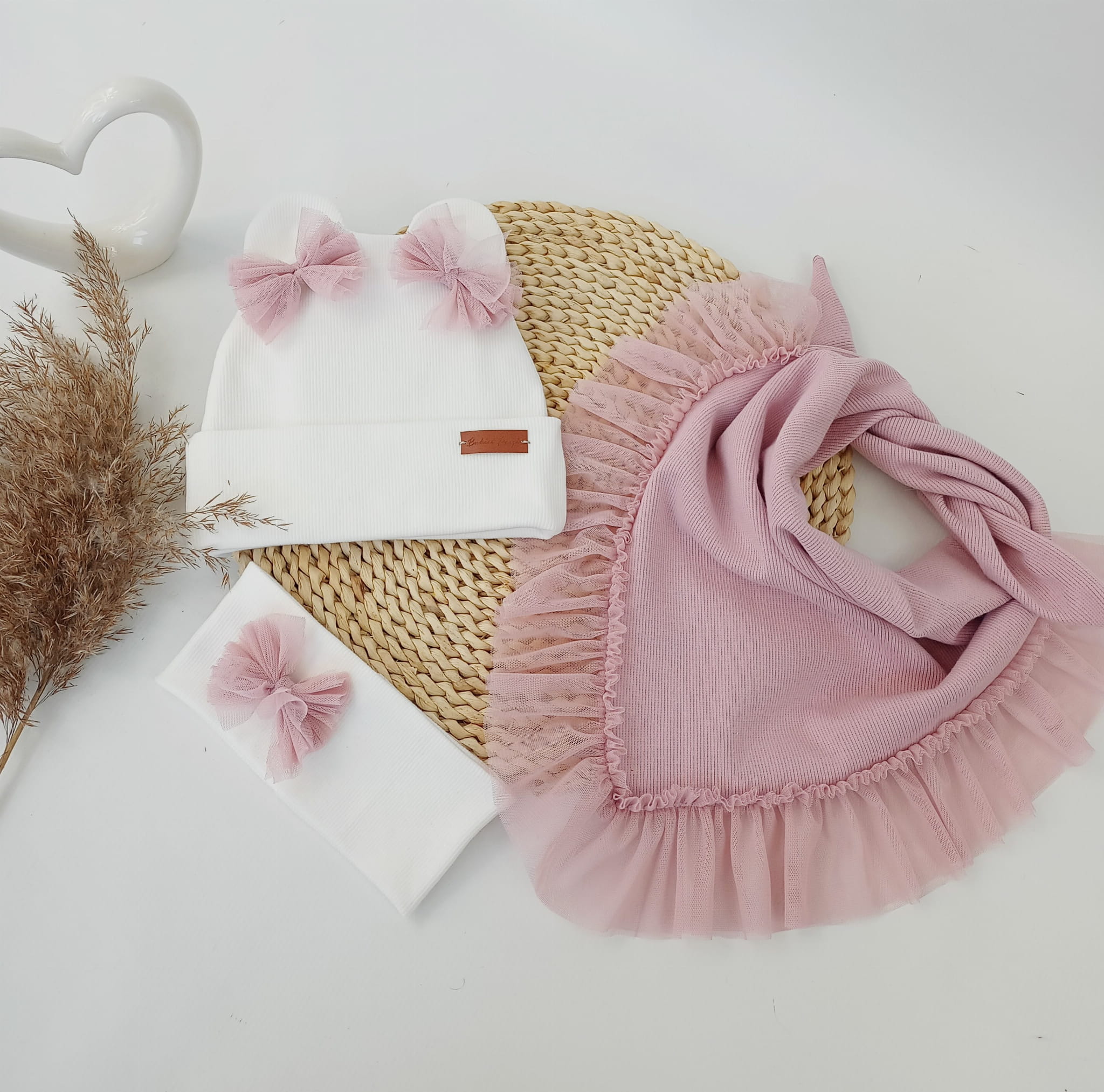 Czapka krem, uszy z chustą z falbanką z tiulu jasny brudny róż