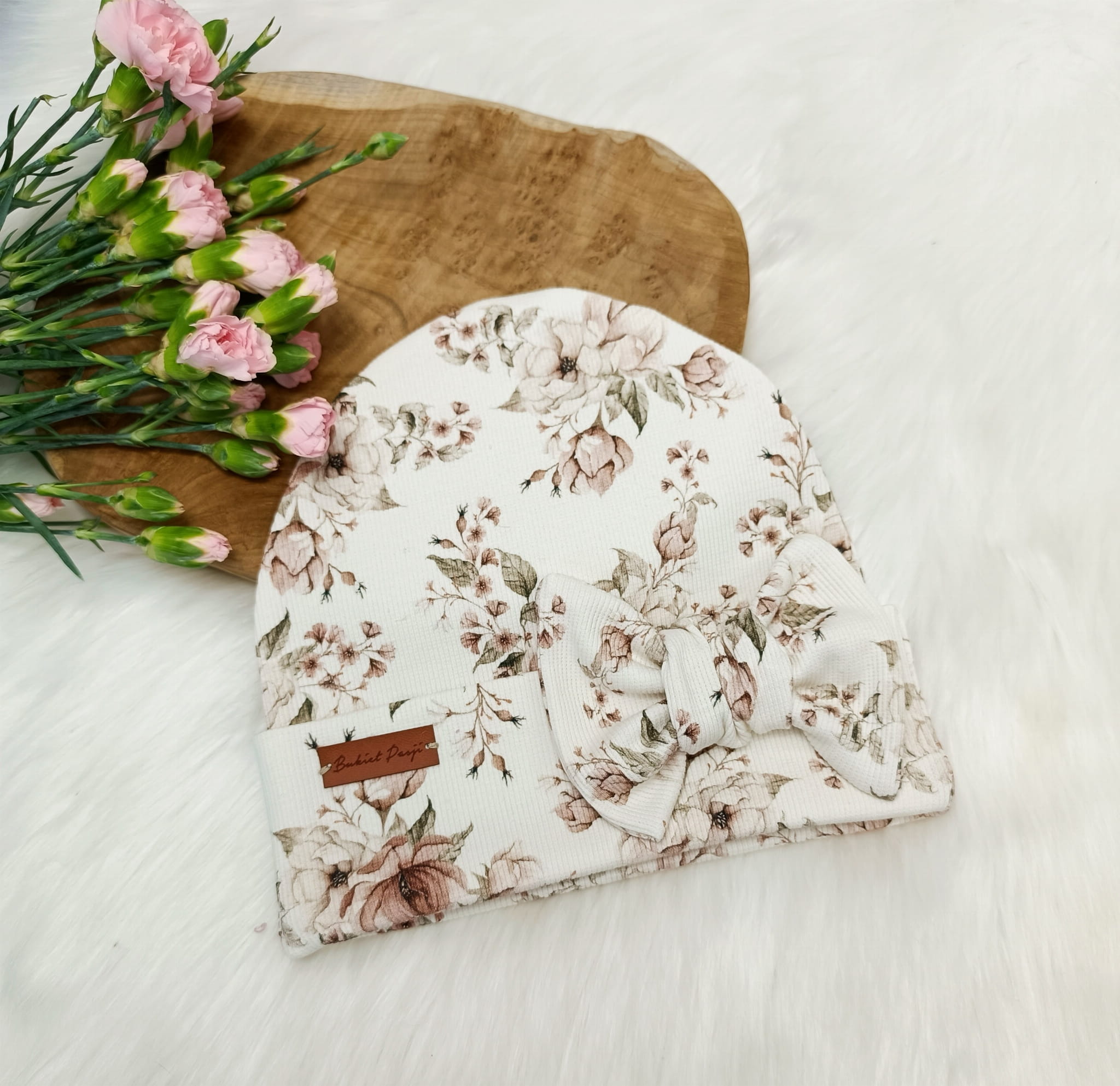 Czapka newbie rosie krem prążek z kokardą
