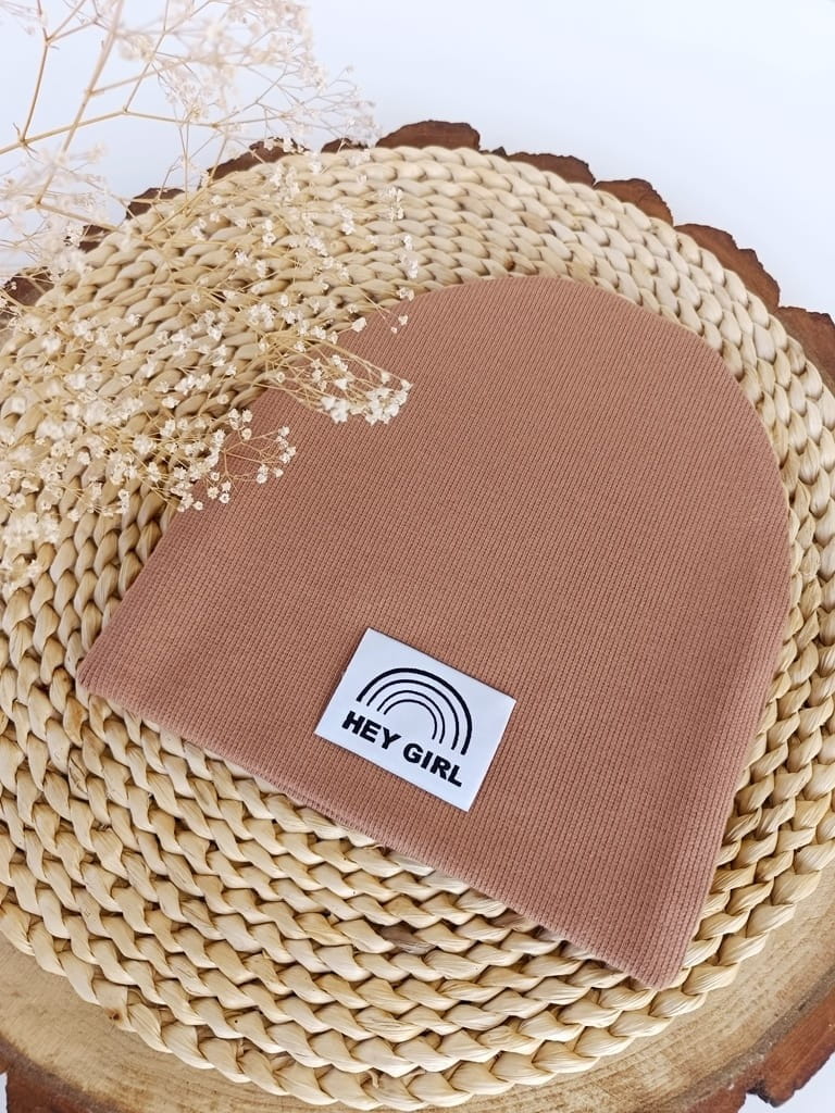Na czapce może być naszyta metka szara podłużna z logo firmy lub HEJ GIRL.