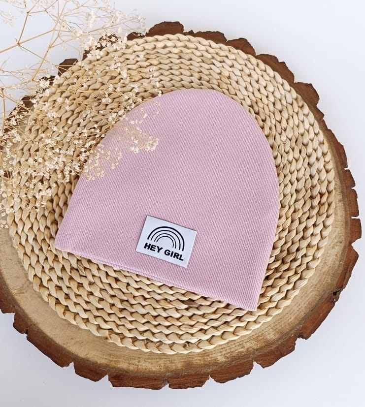 Na czapce może być naszyta metka szara podłużna z logo firmy lub HEJ GIRL.
