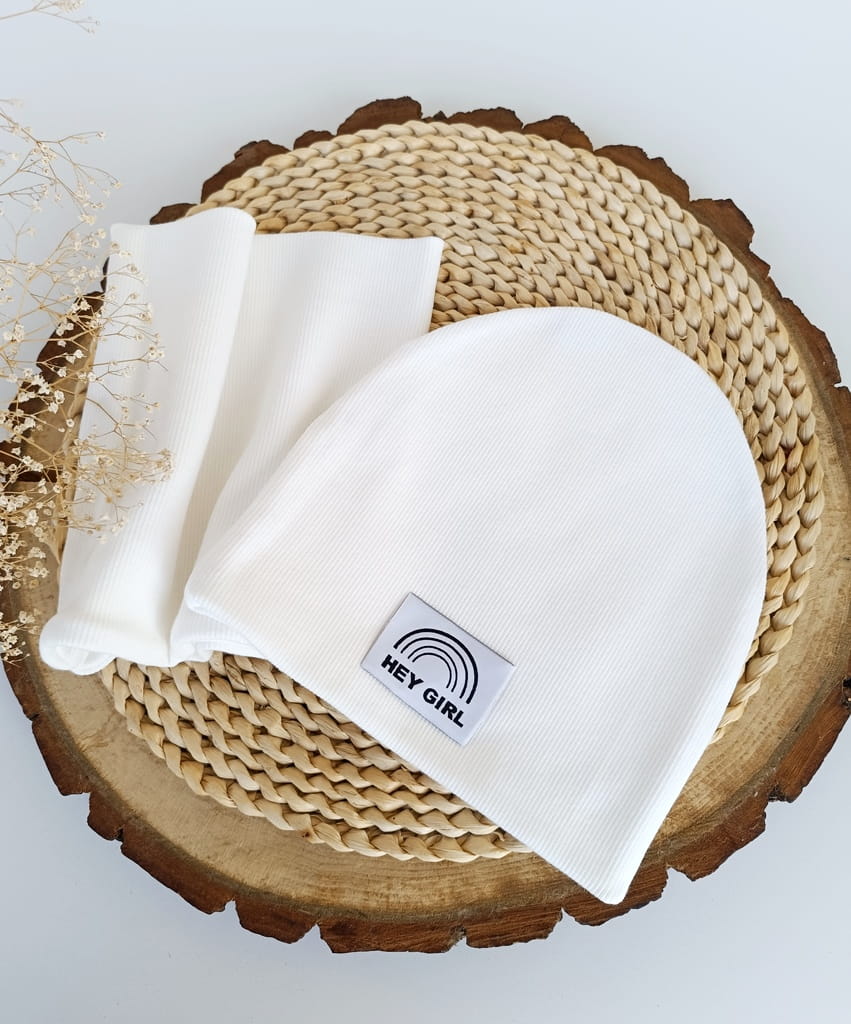 Na czapce może być naszyta metka szara podłużna z logo firmy lub HEJ GIRL.
