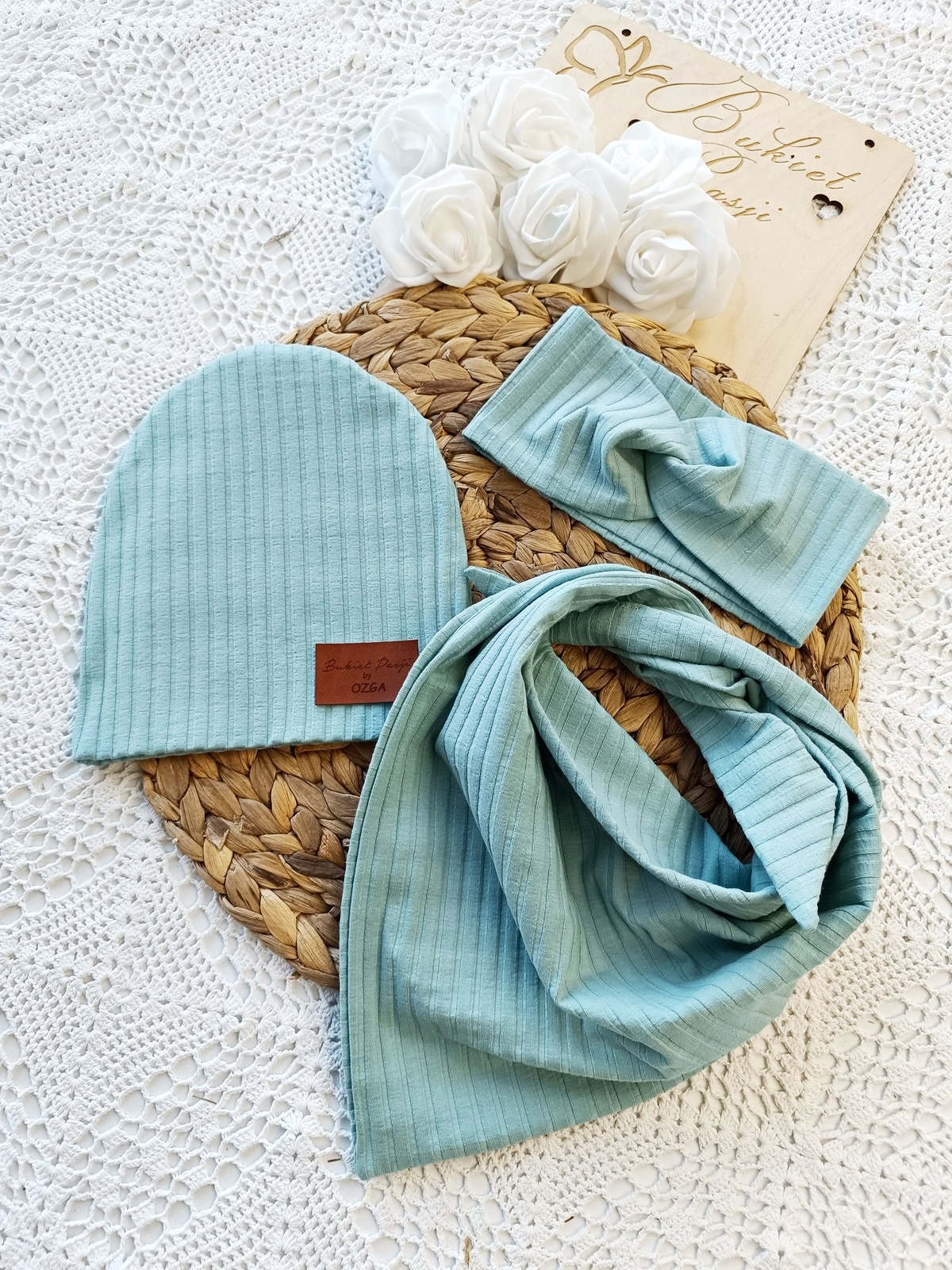 Czapeczka i chusta z podwójnej dzianiny bawełnianej prążkowej.