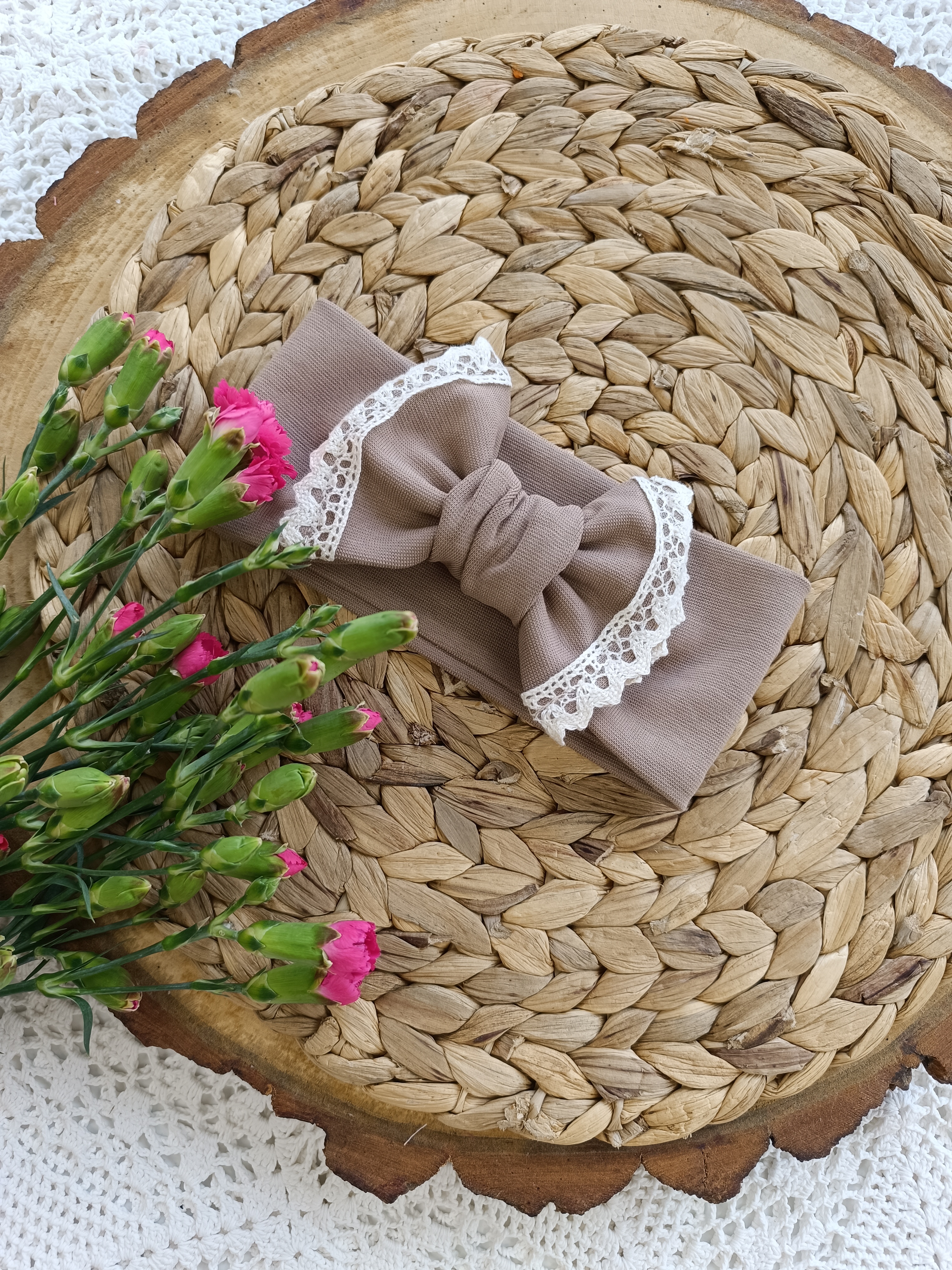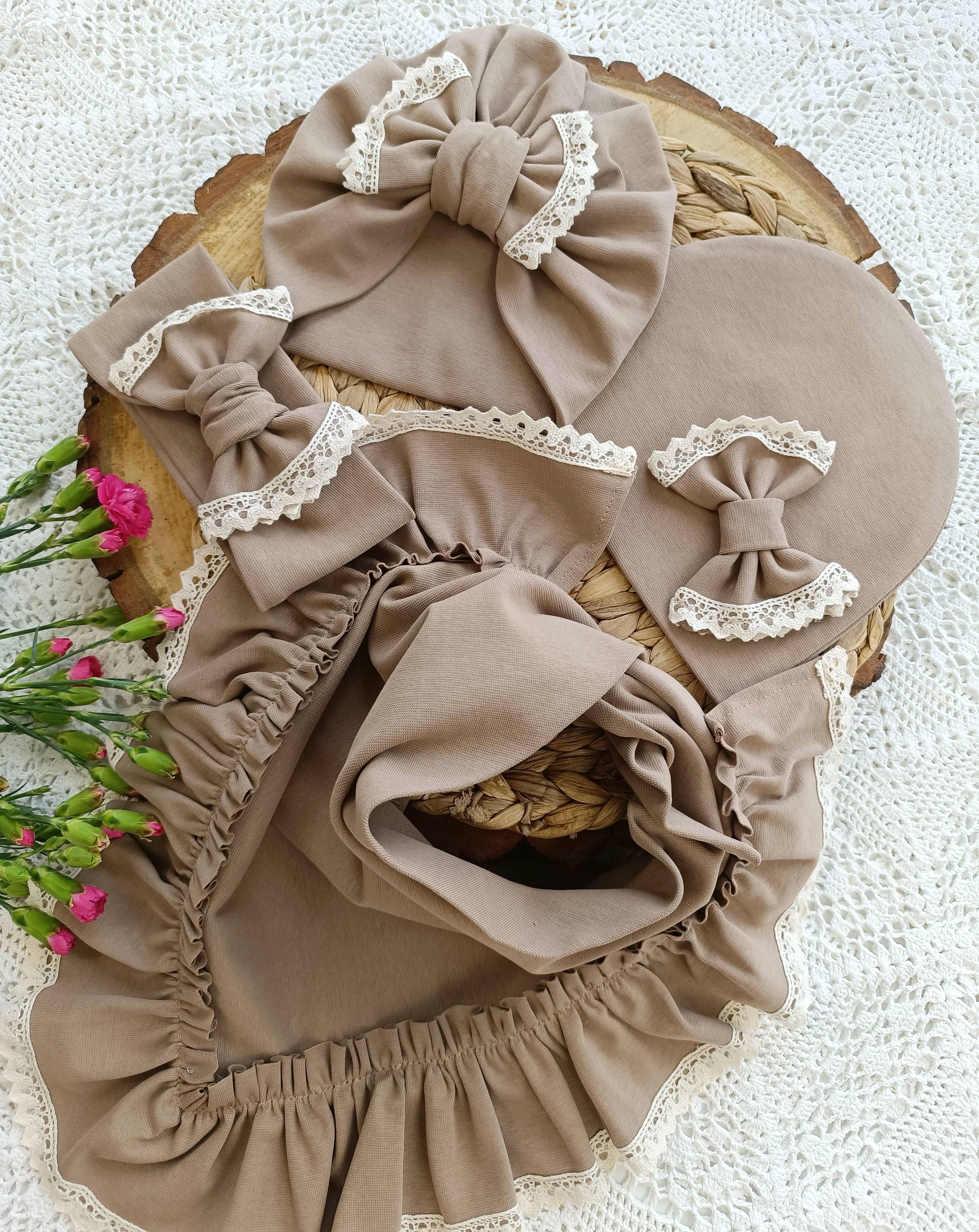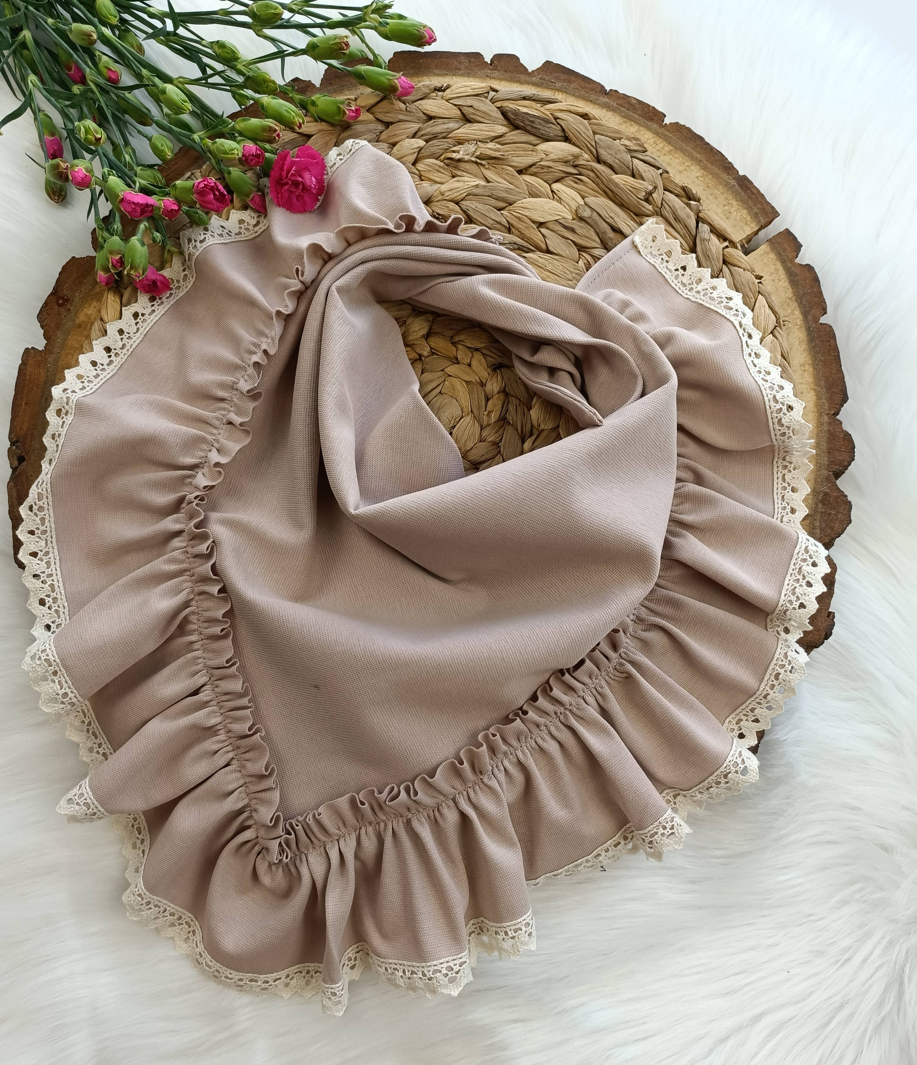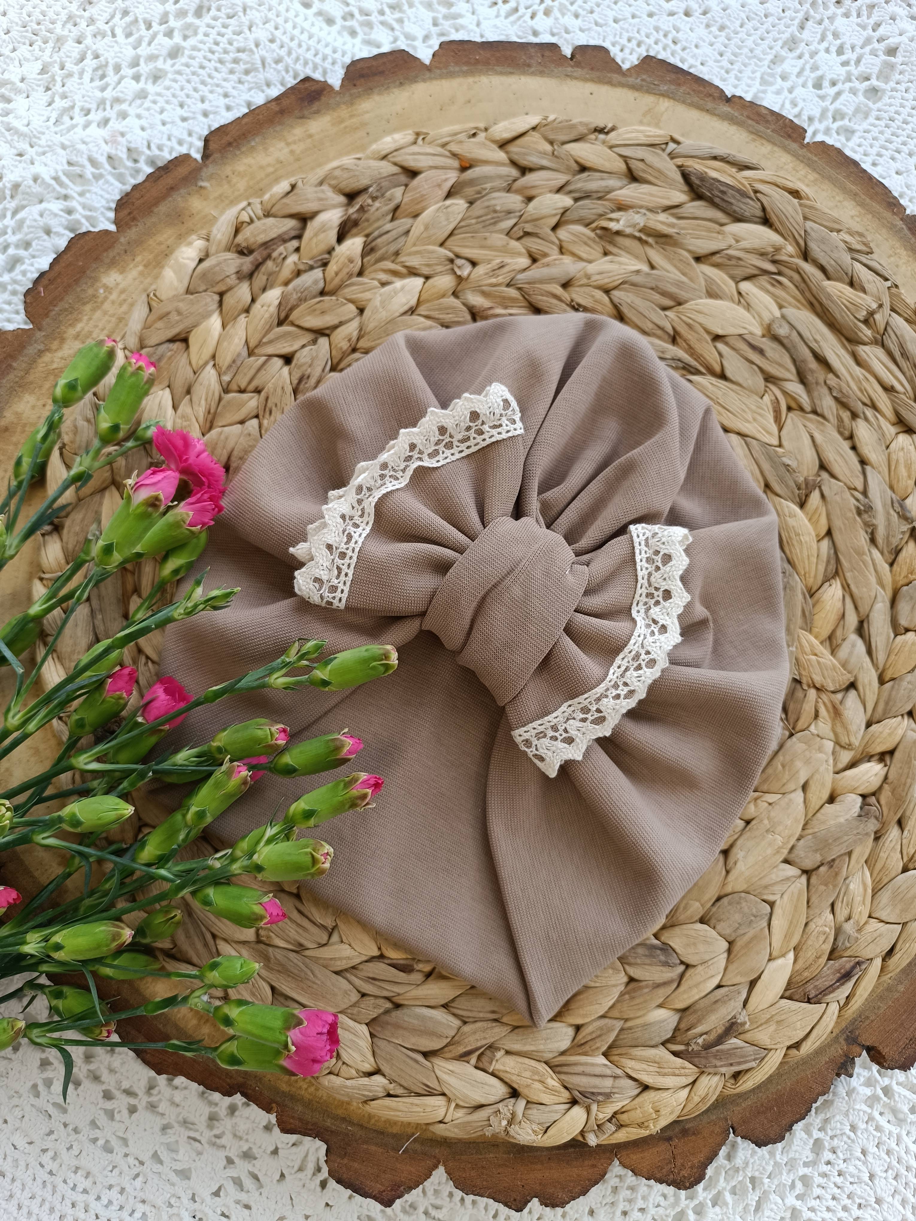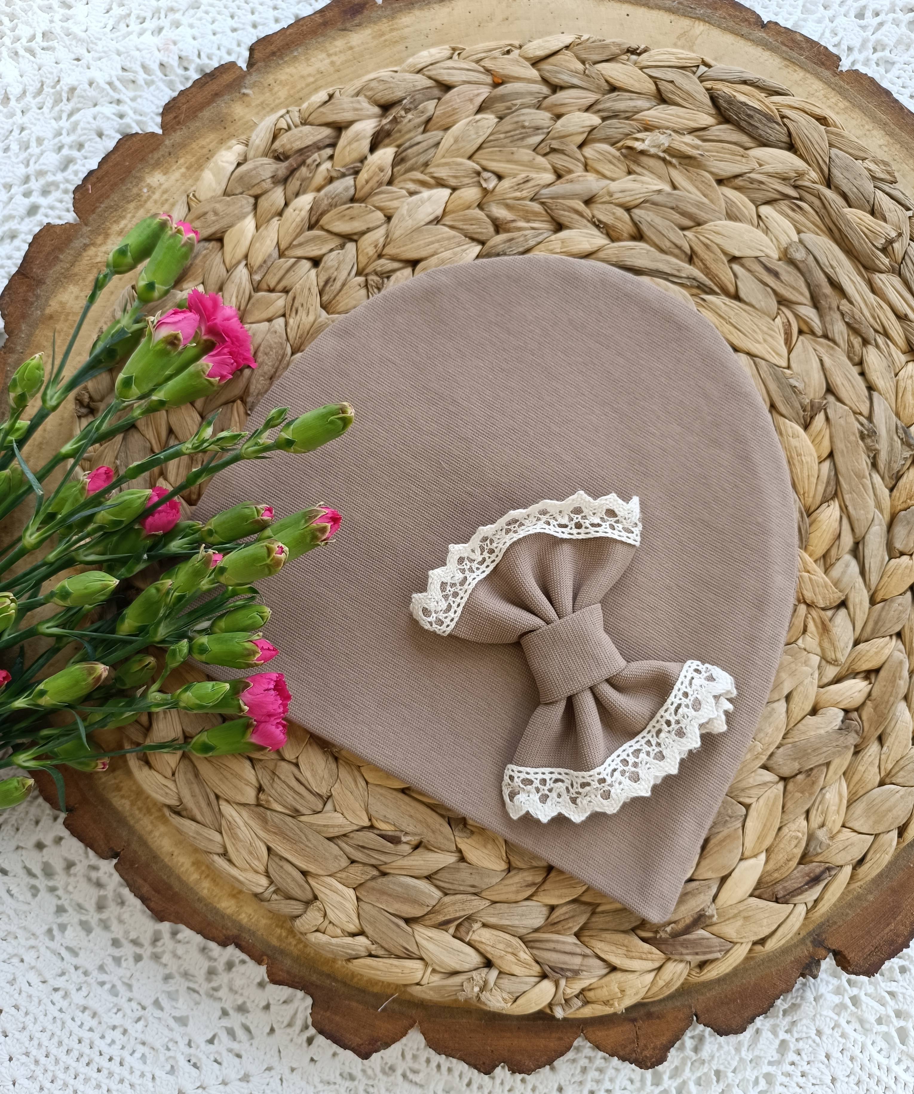 Czapka z chustą wiązaną falbanka z koronką ciemny beż ŚB