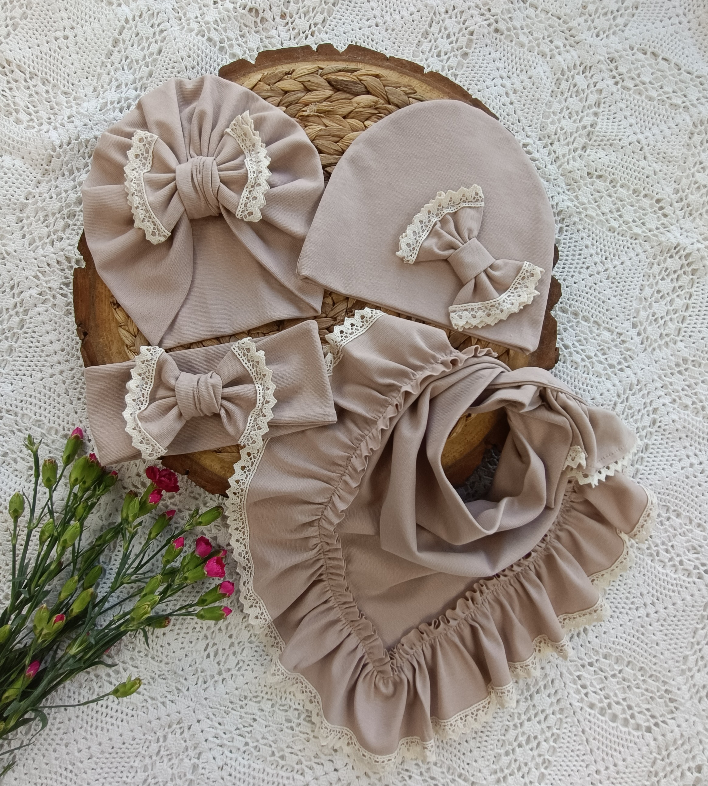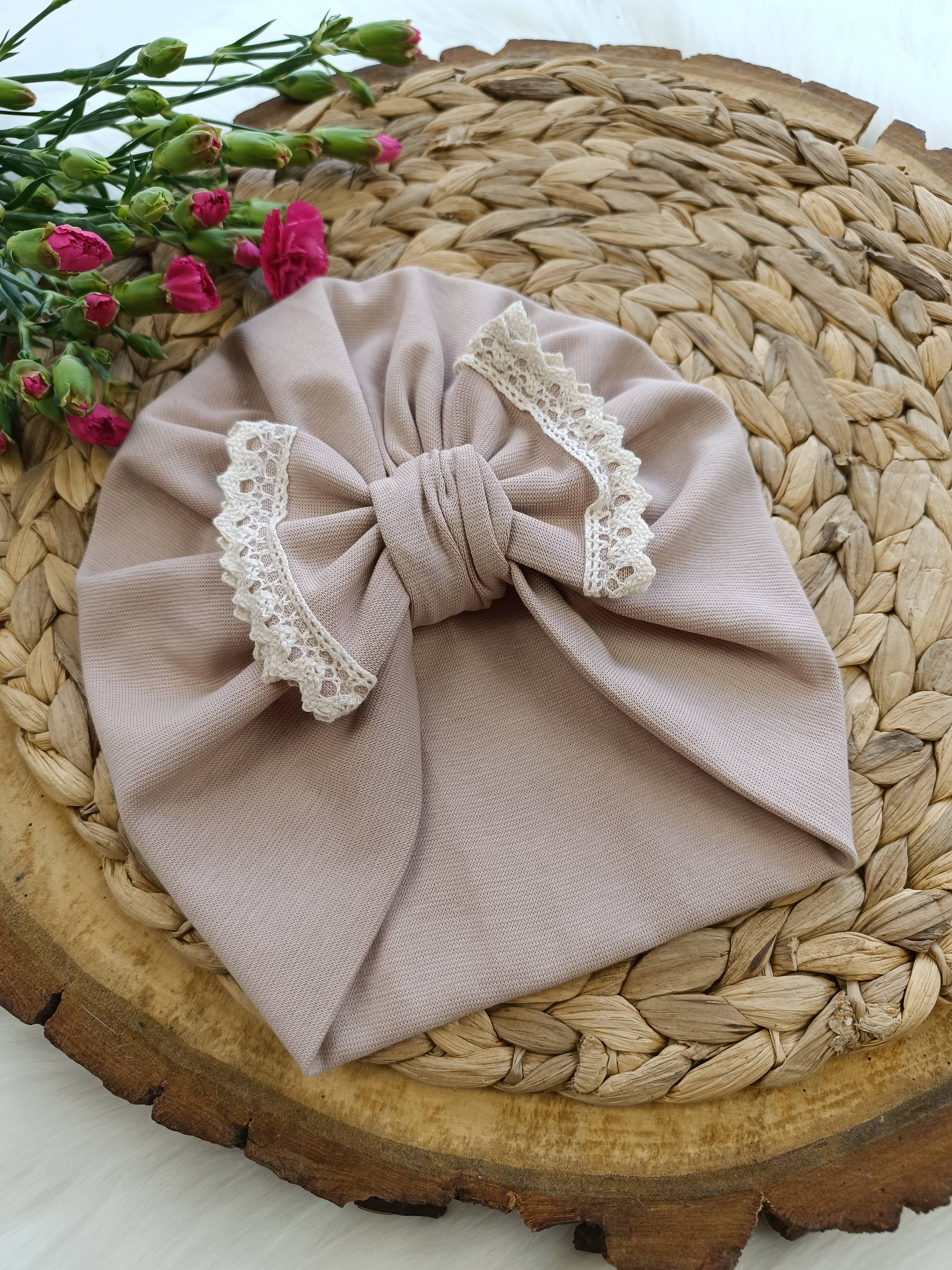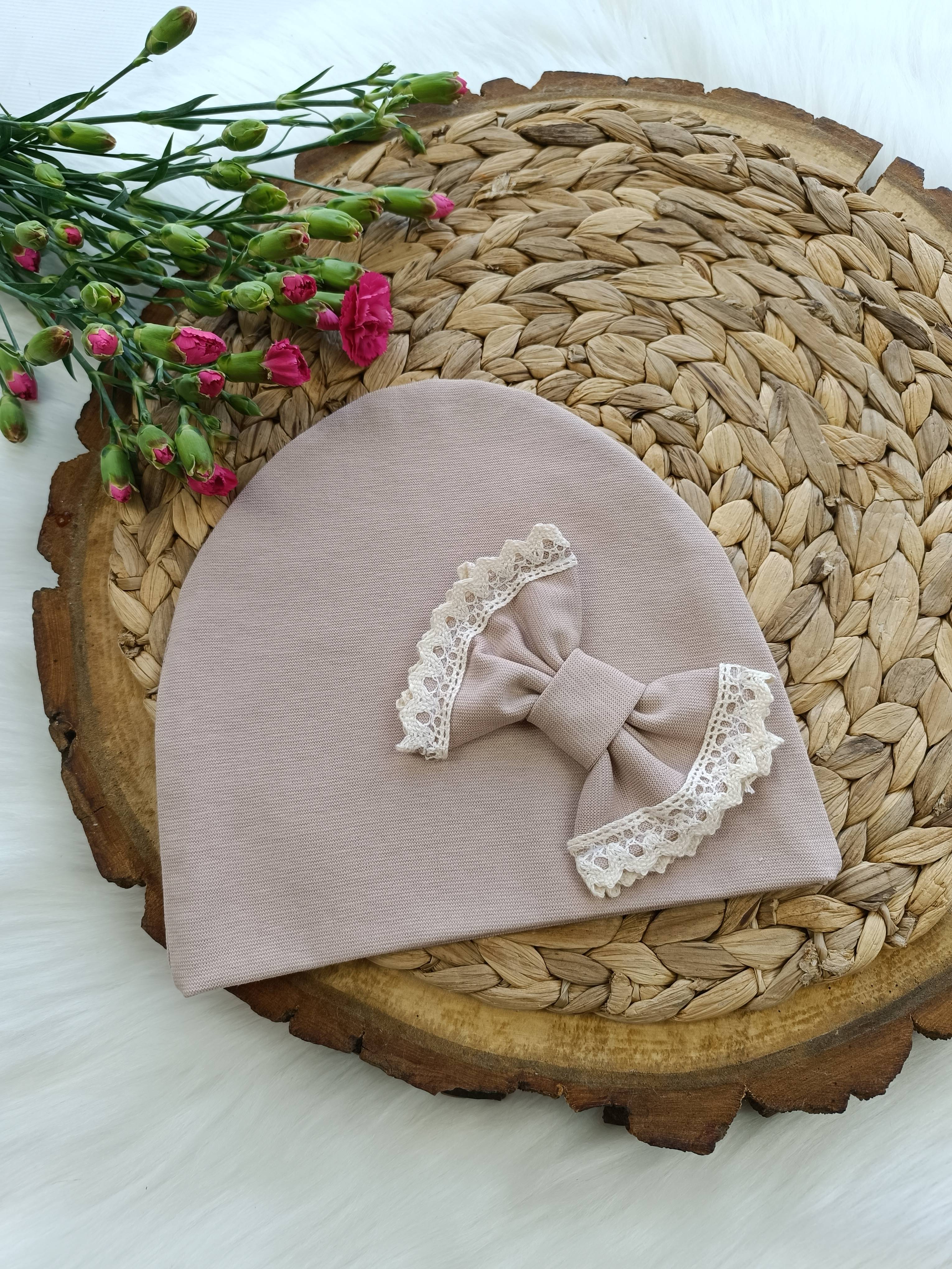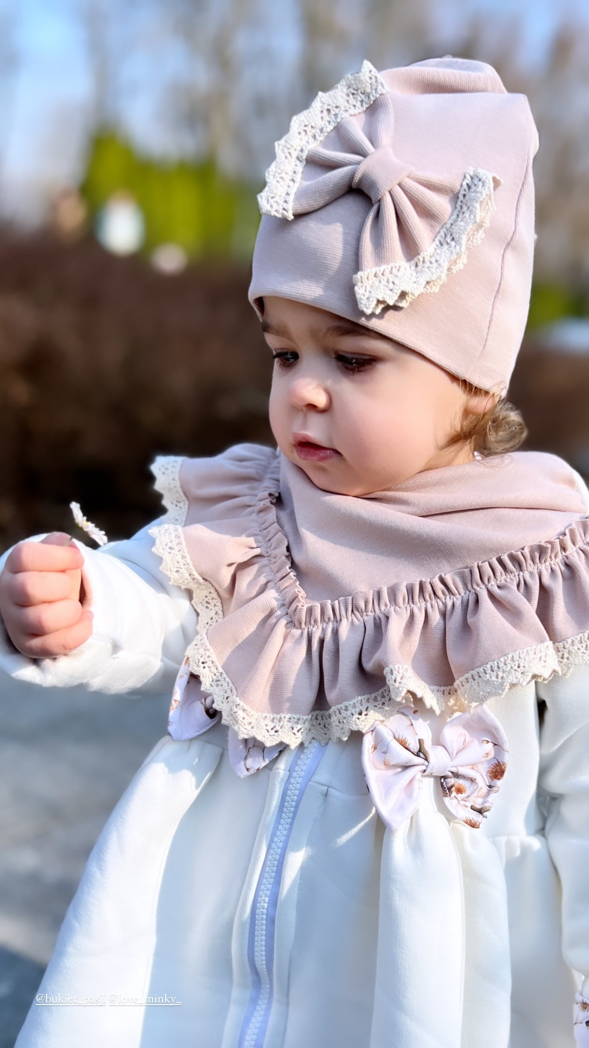 Czapka z chustą wiązaną falbanka z koronką jasny beż ŚB