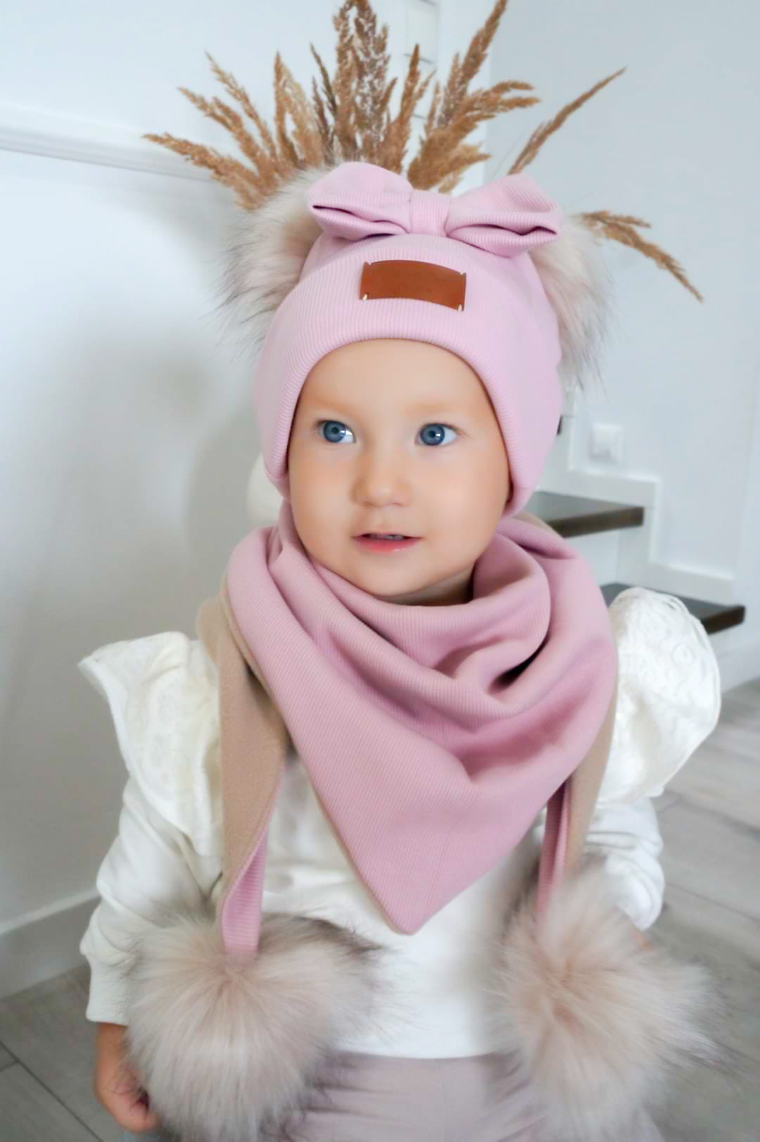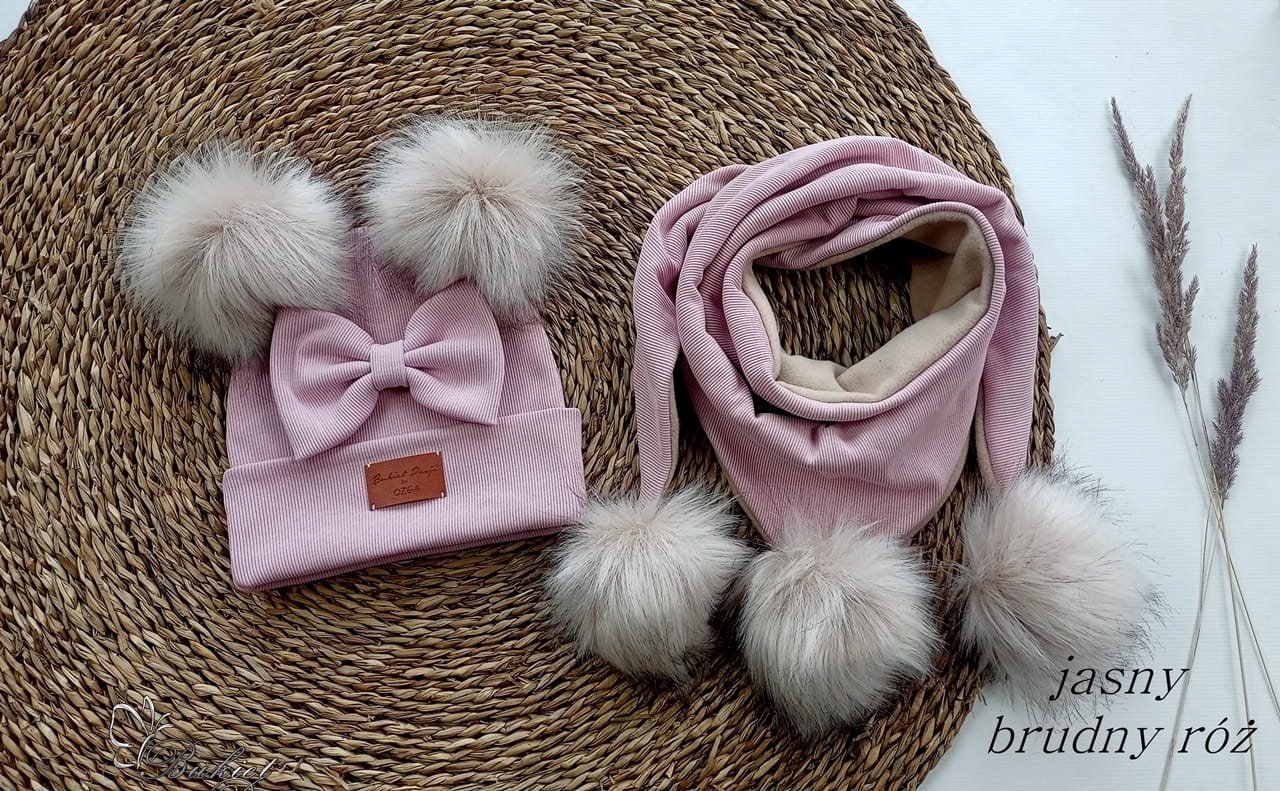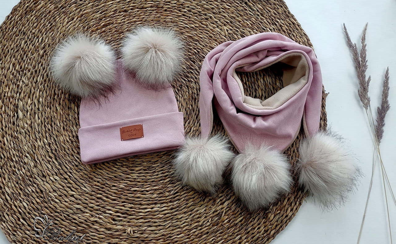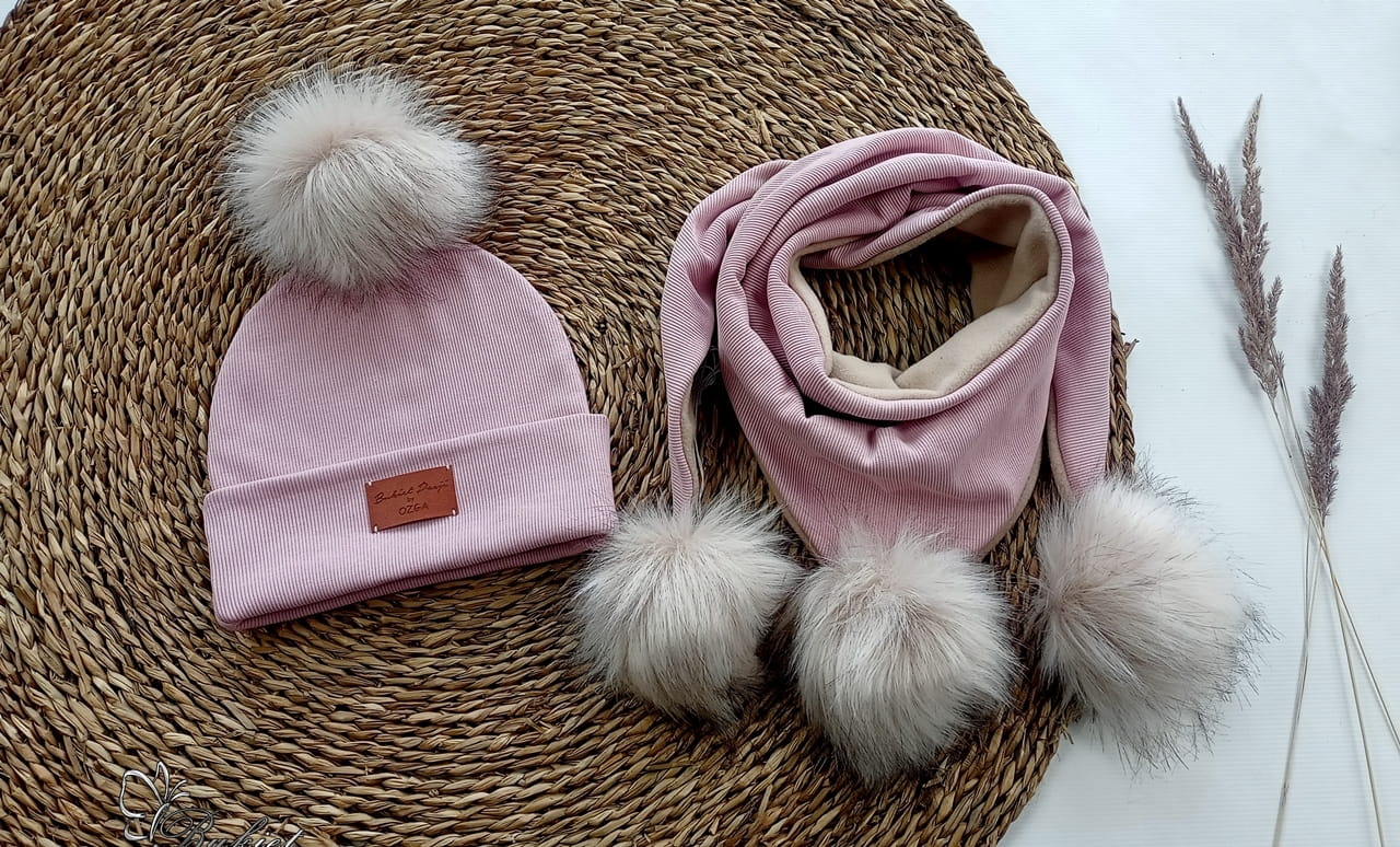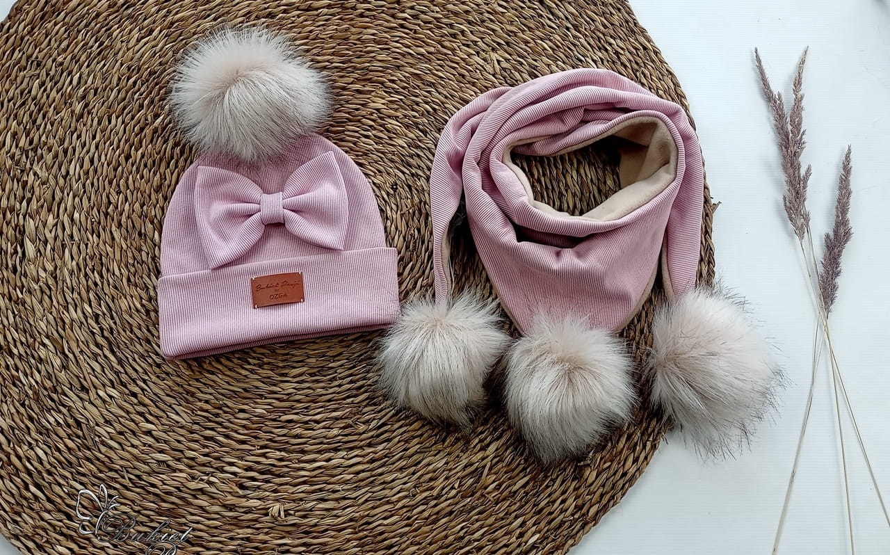 Czapka z kominem/chustą jasny brudny róż ZIMA