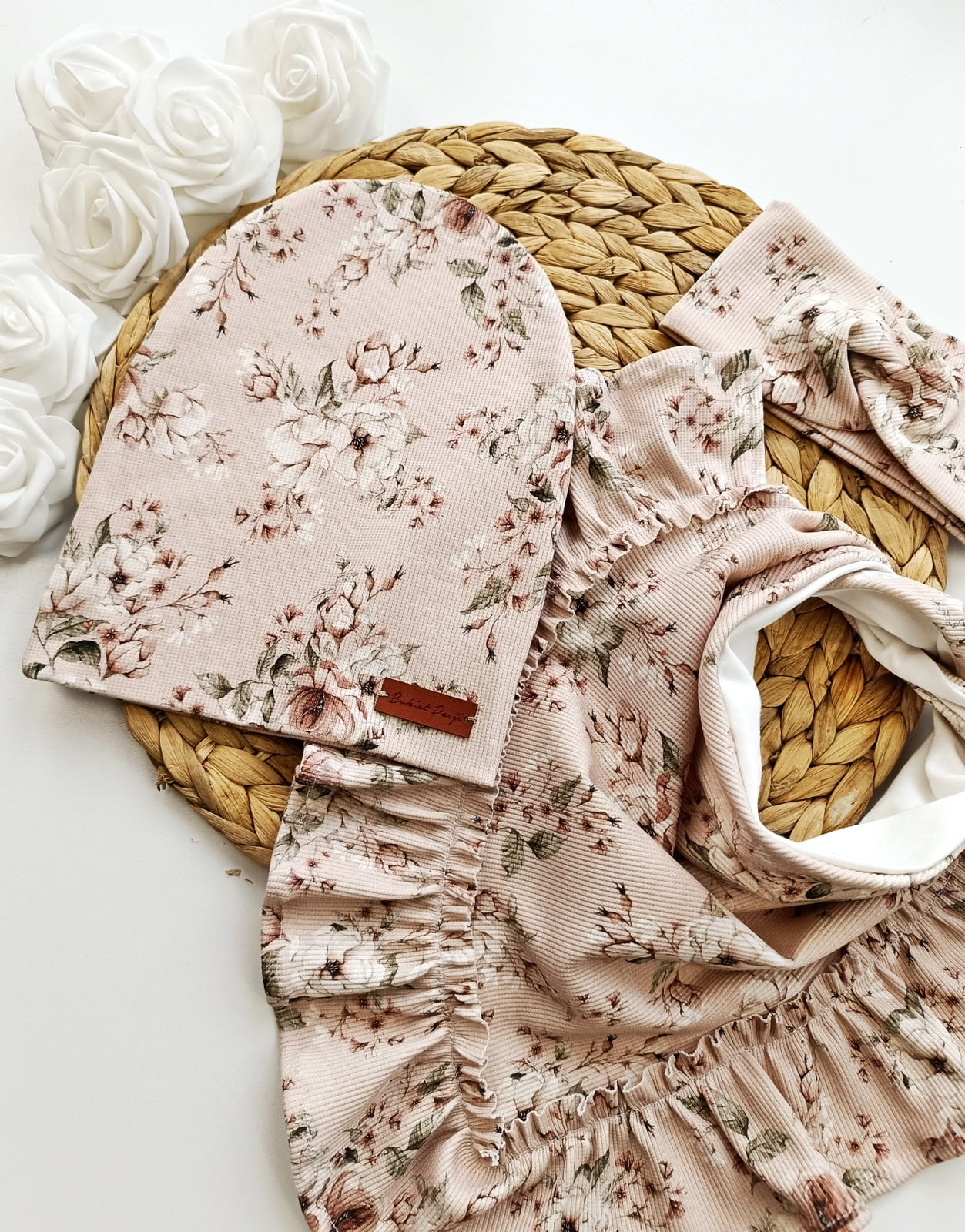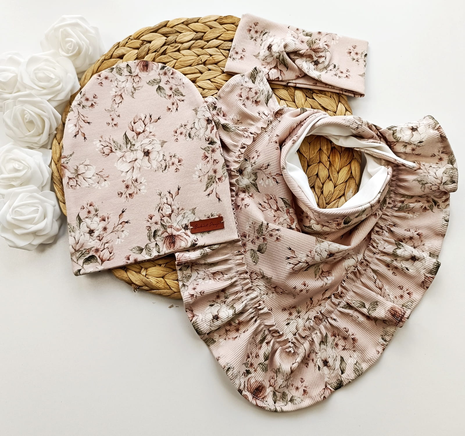 Czapeczka jest połączona z uroczą chustką wiązaną z tyłu, ozdobioną delikatną falbanką. Możesz również wybrać wersję bez falbanki, klasyczną chustę wiązaną, albo wersję z zatrzaskami – także z falbanką! Dostępność różnych wersji daje Ci pełną swobodę wyboru idealnego modelu dla Twojego dziecka.