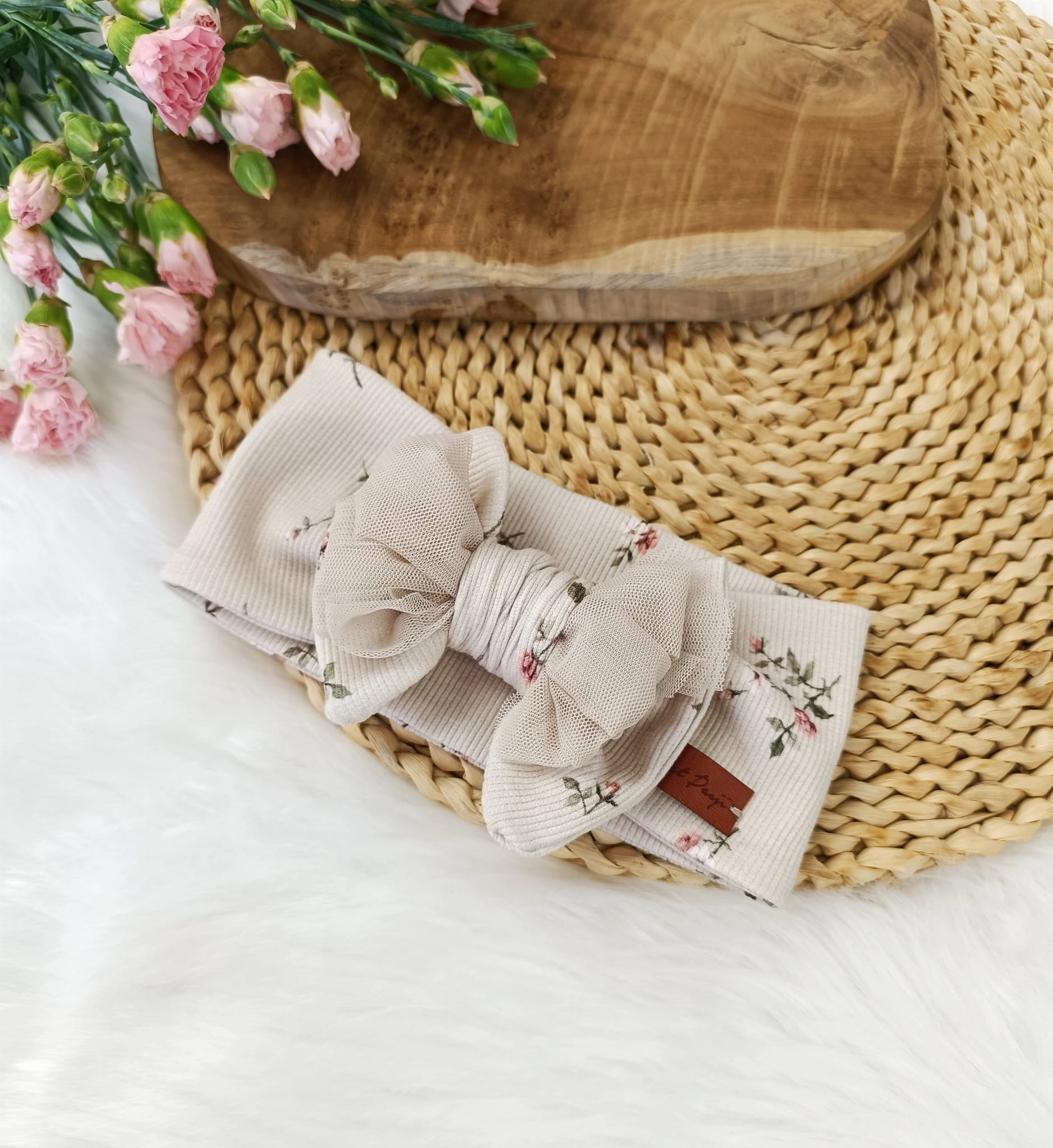 Opaska z kokardą tiul drobne różyczki beż prążek