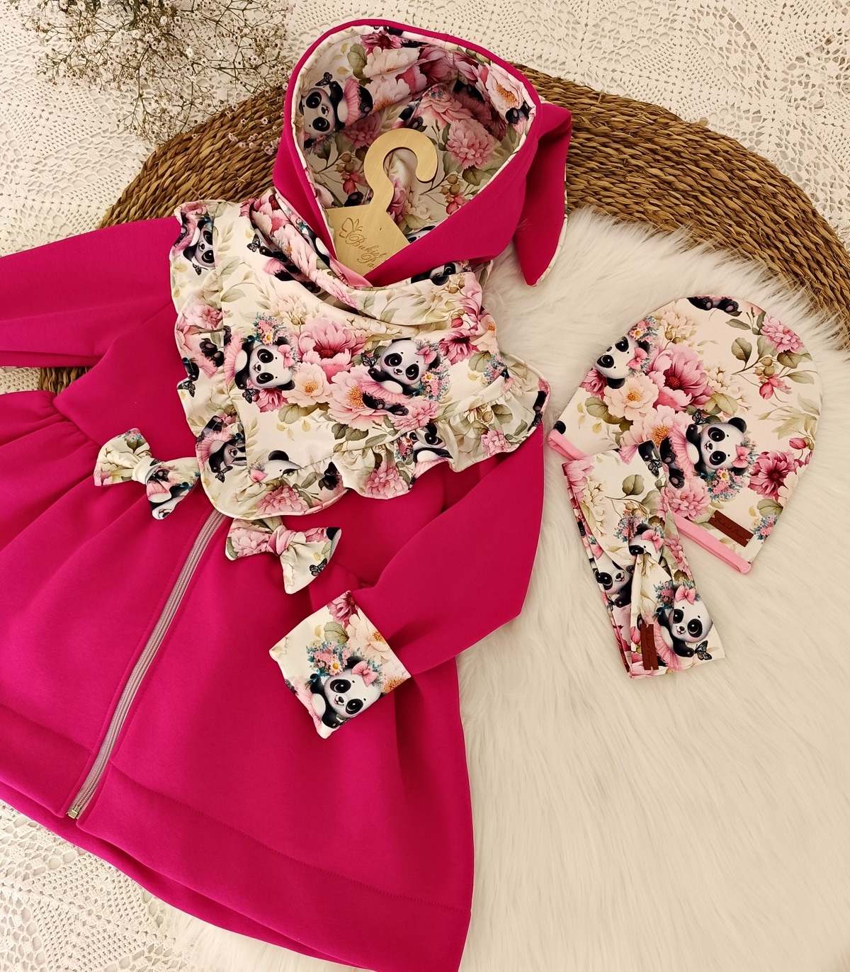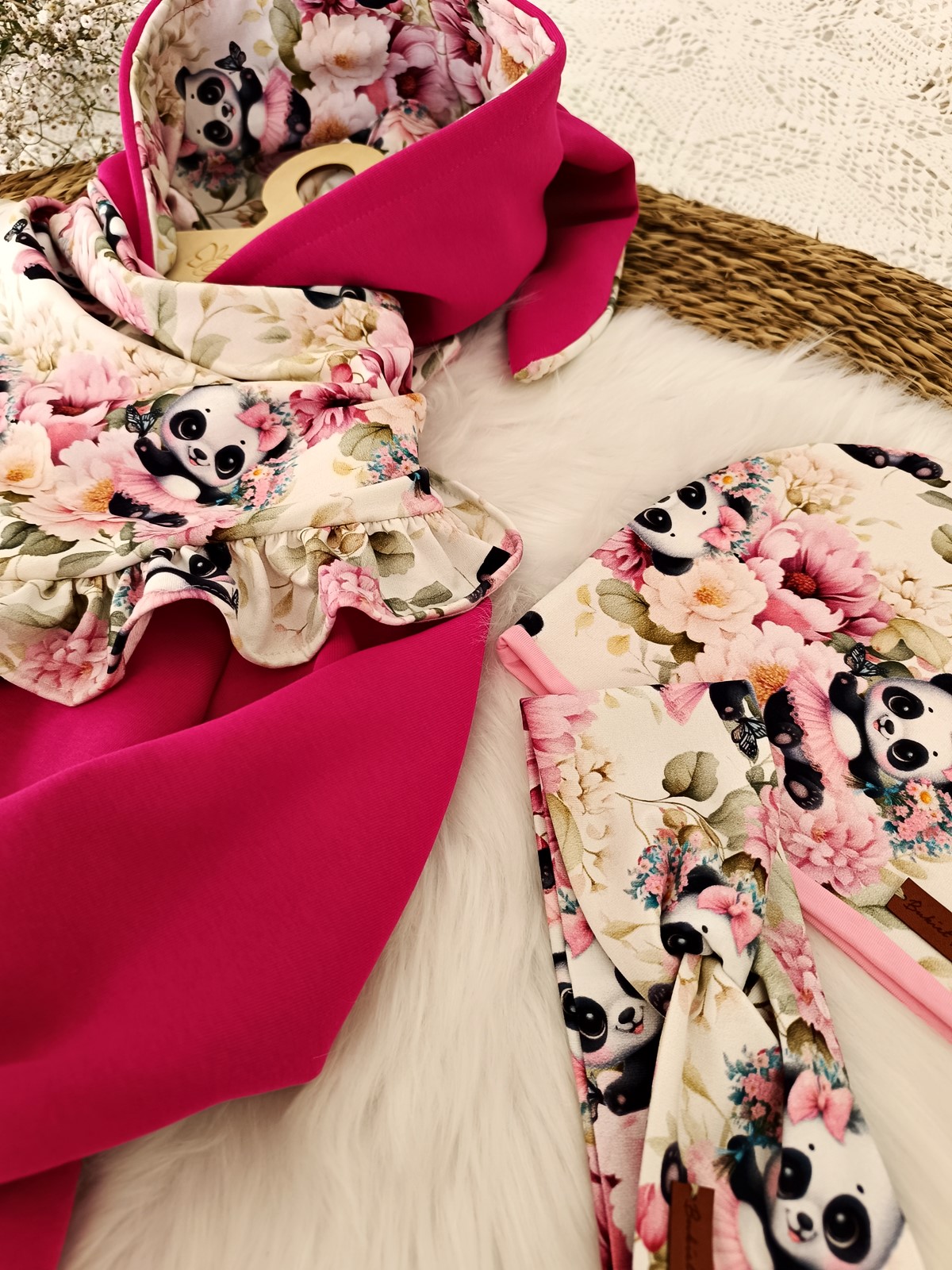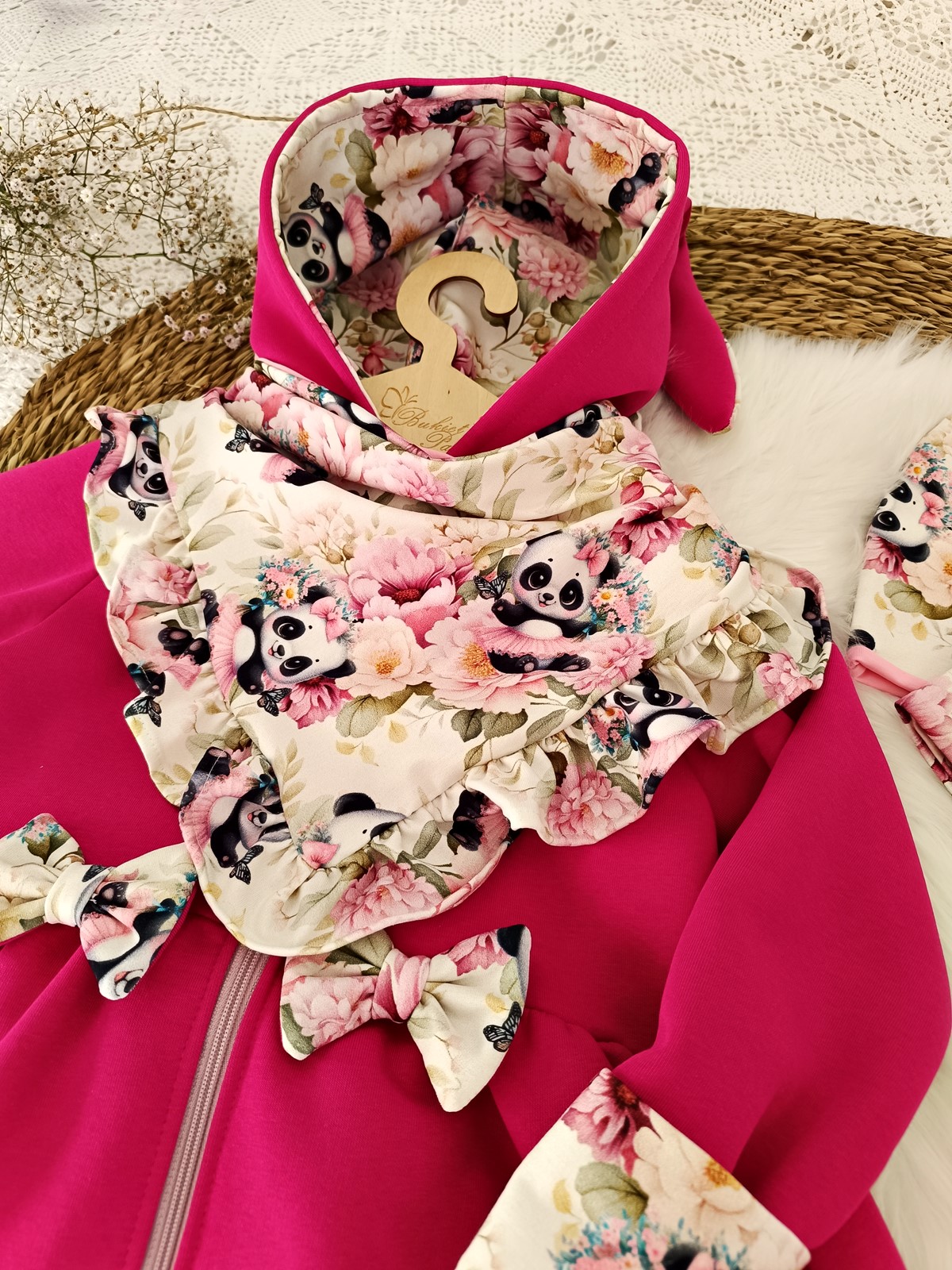 Całość jest ozdobiona delikatnym, kwiatowym motywem z uroczymi pandami w wyjątkowych odcieniach w którym każda mała dama będzie się czuć jak w świecie baśni.