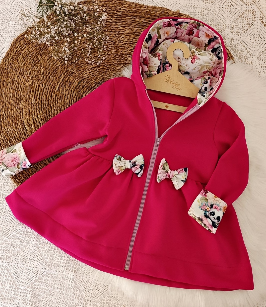 Dziewczęca kurteczka na jesień to romantyczna stylizacja w pandy w kwiatach z uroczymi uszkami nadaje jej charakteru kreskówkowej księżniczki.