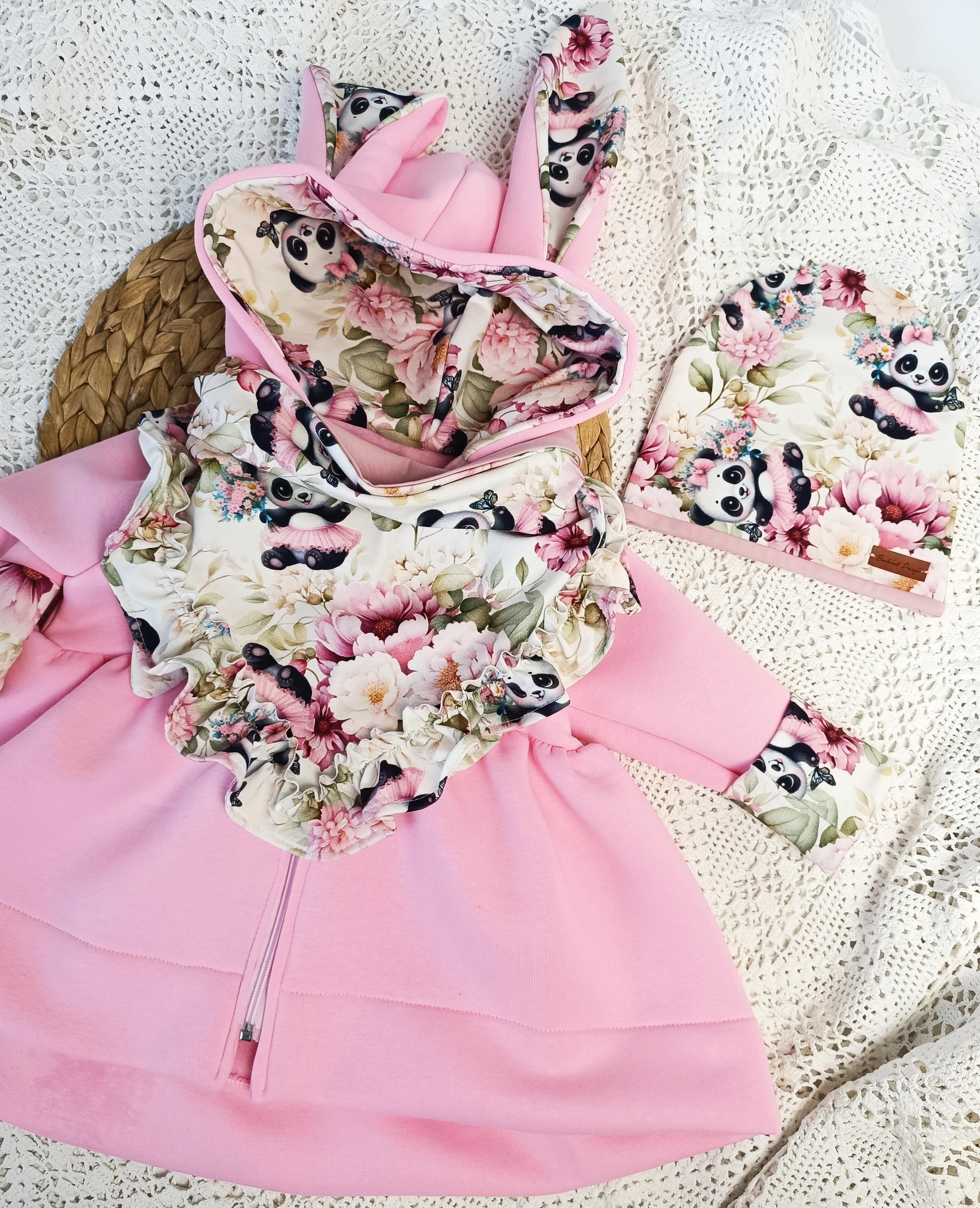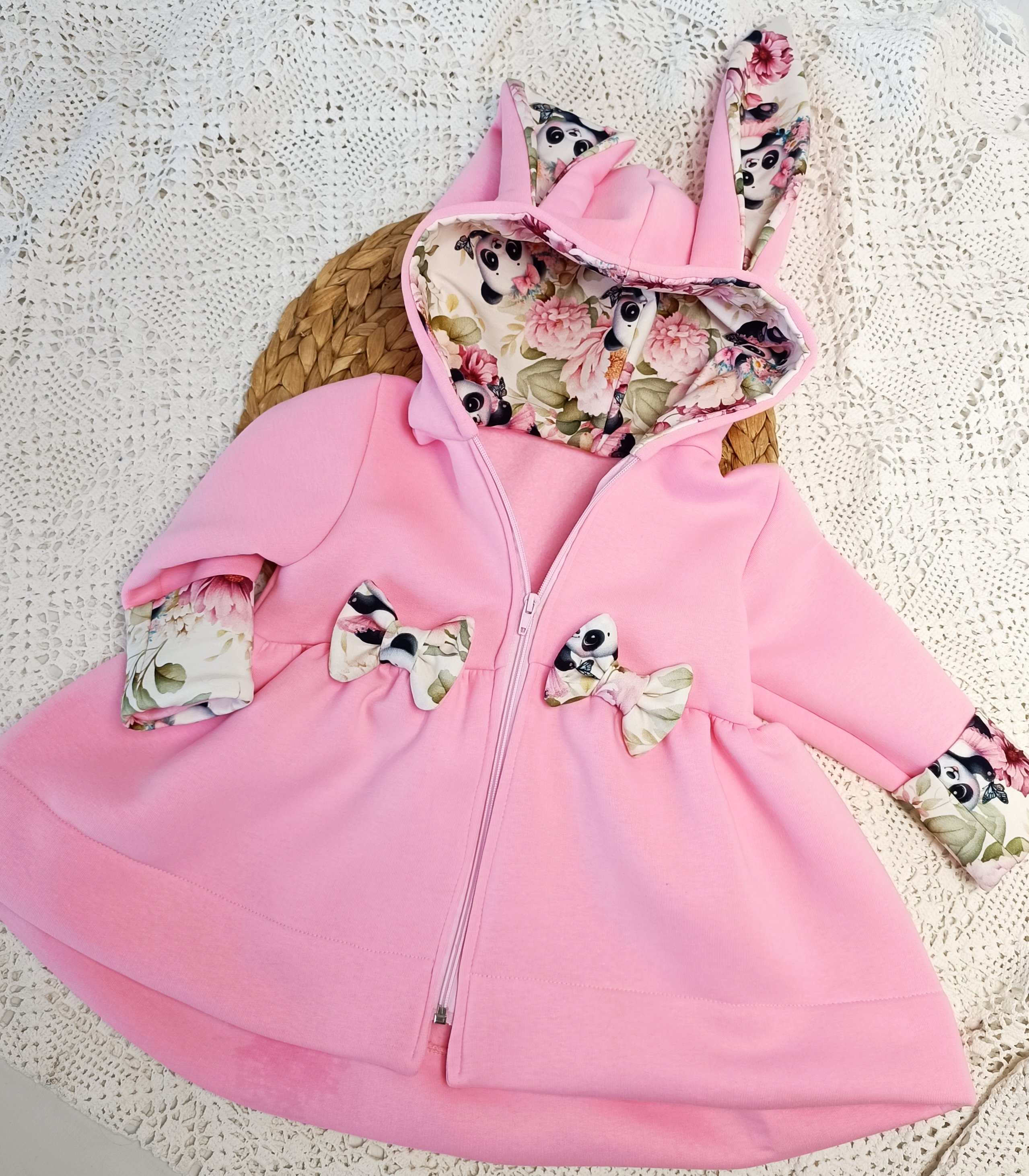 Dziewczęca kurteczka na jesień to romantyczna stylizacja w pandy w kwiatach z uroczymi uszkami nadaje jej charakteru kreskówkowej księżniczki.