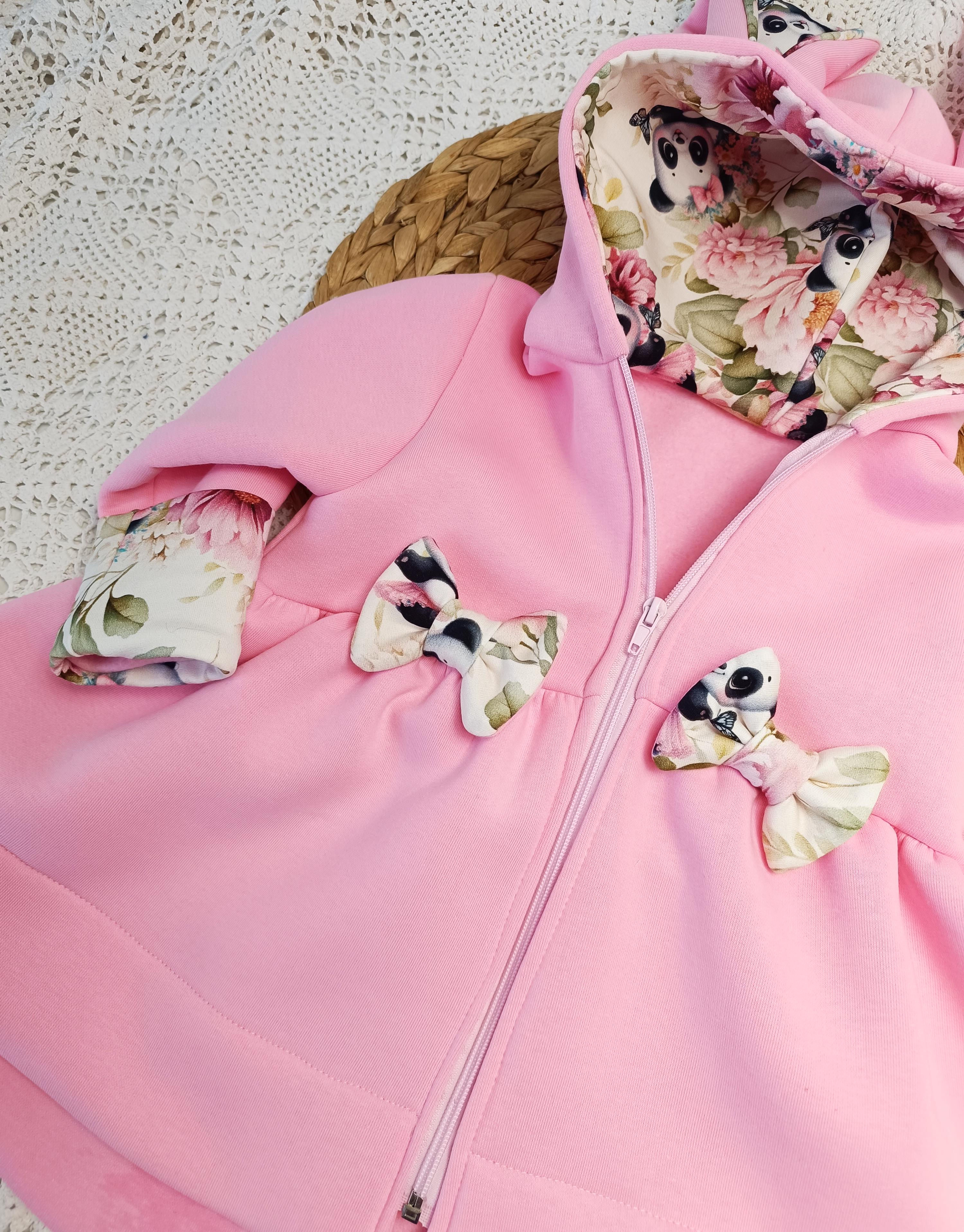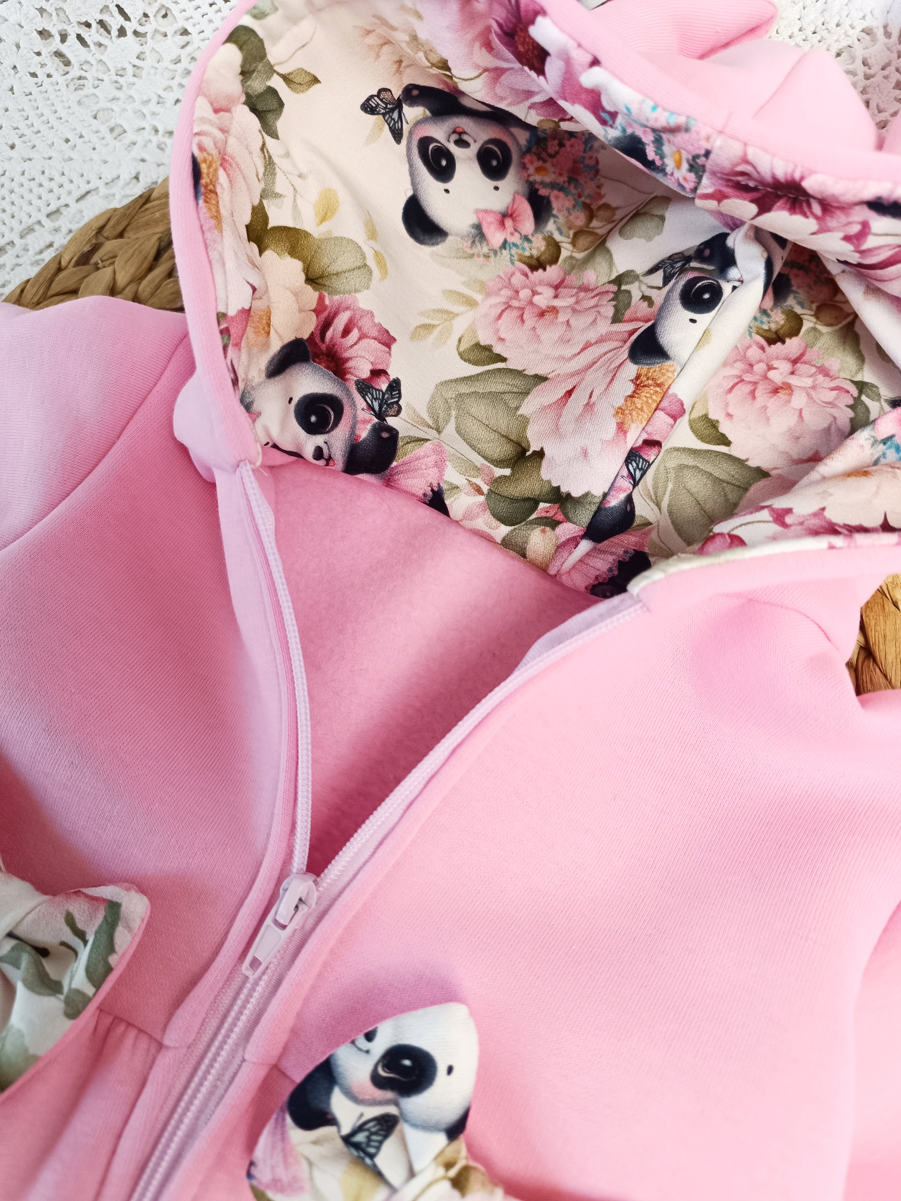 Płaszczyk dla dziewczynki jasny róż, pandy w kwiaty