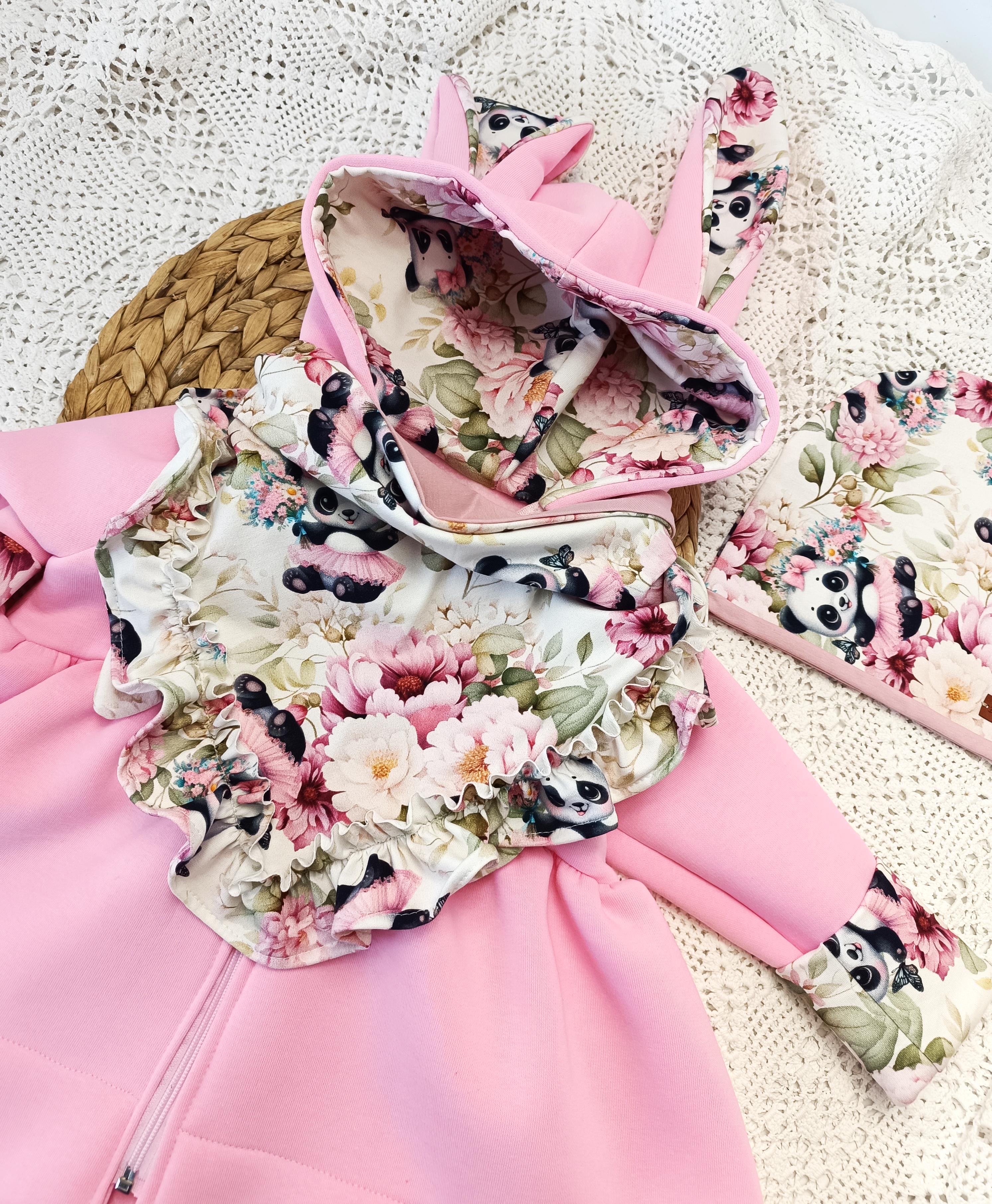 Całość jest ozdobiona delikatnym, kwiatowym motywem z uroczymi pandami w wyjątkowych odcieniach w którym każda mała dama będzie się czuć jak w świecie baśni.
