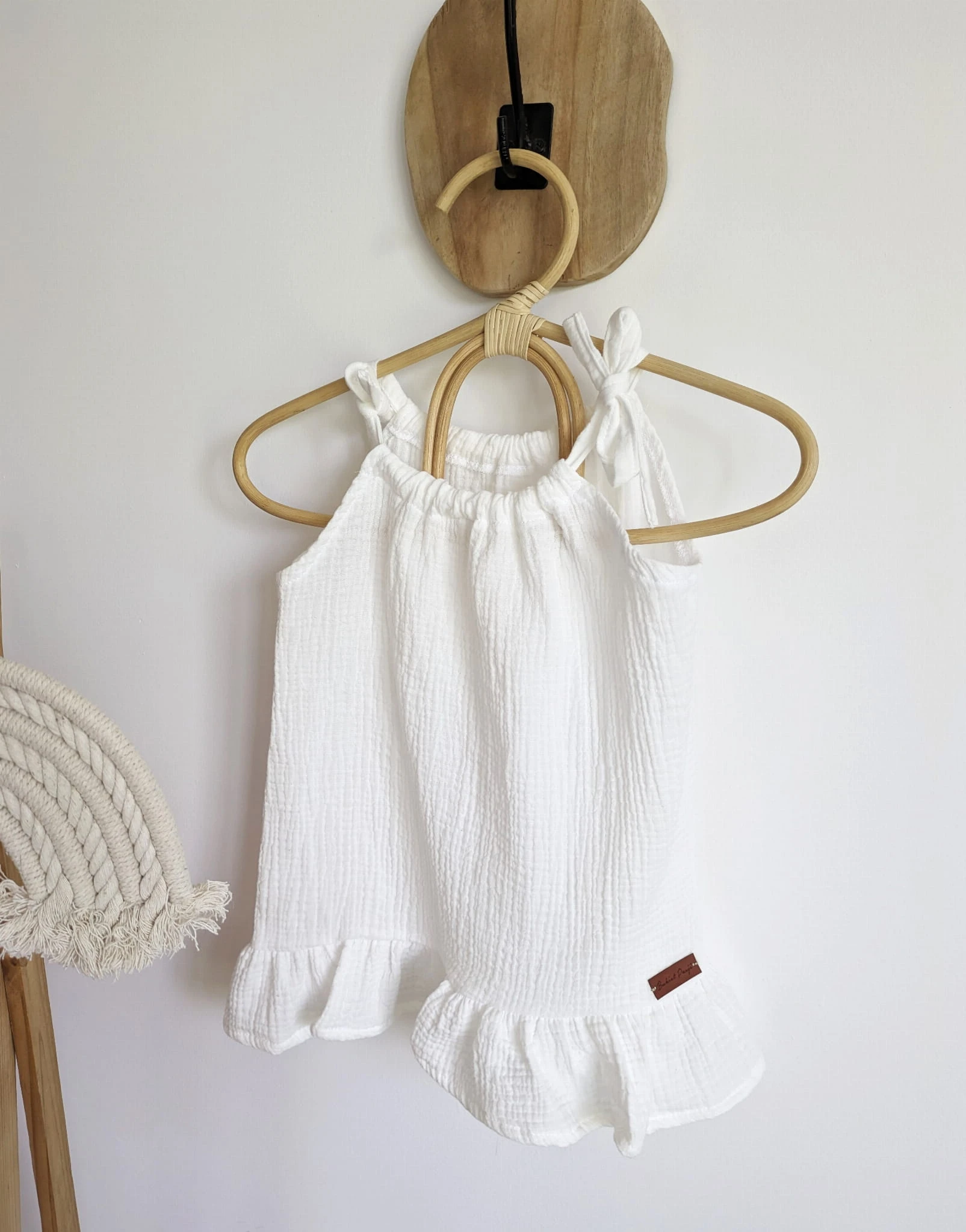 Urocza sukienka uszyta z naturalnego muślinu bawełnianego który zapewni Twojemu dziecku maksymalny komfort i styl w ciepłe dni.