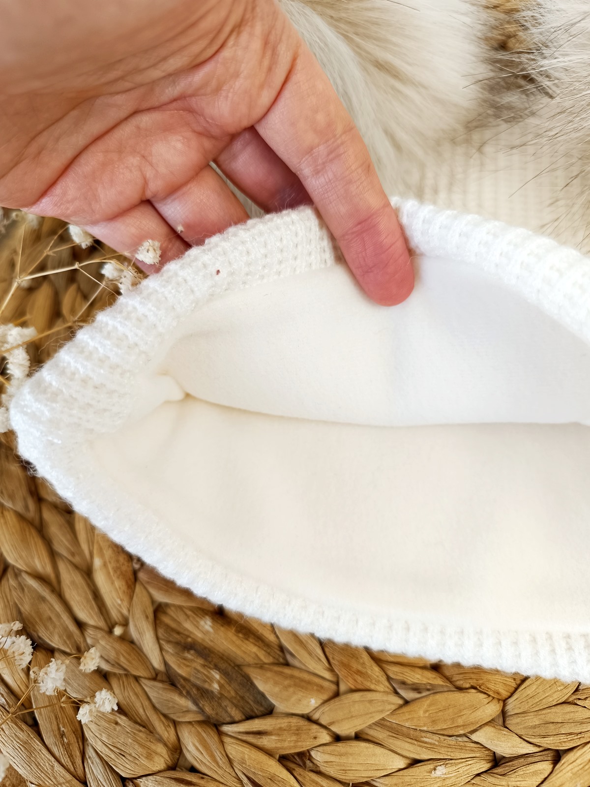 Czapkę wykonuję z dzianiny swetrowej podszytej ciepłym polarkiem.